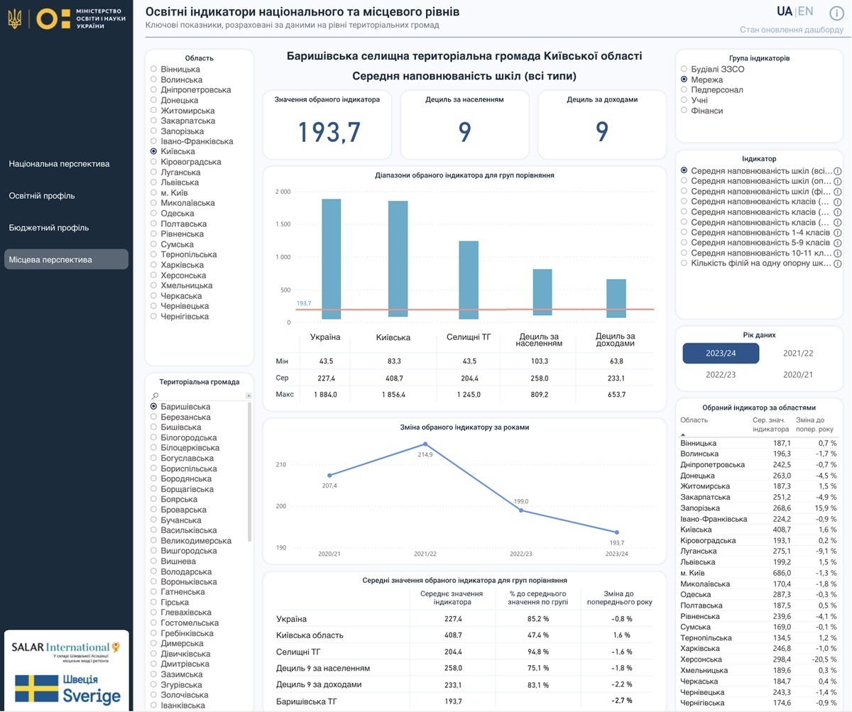Скриншот дашборду сторінки «Місцева перспектива» індикатора «Баришівська селищна територіальна громада Київської області» – «Середня наповнюваність шкіл»