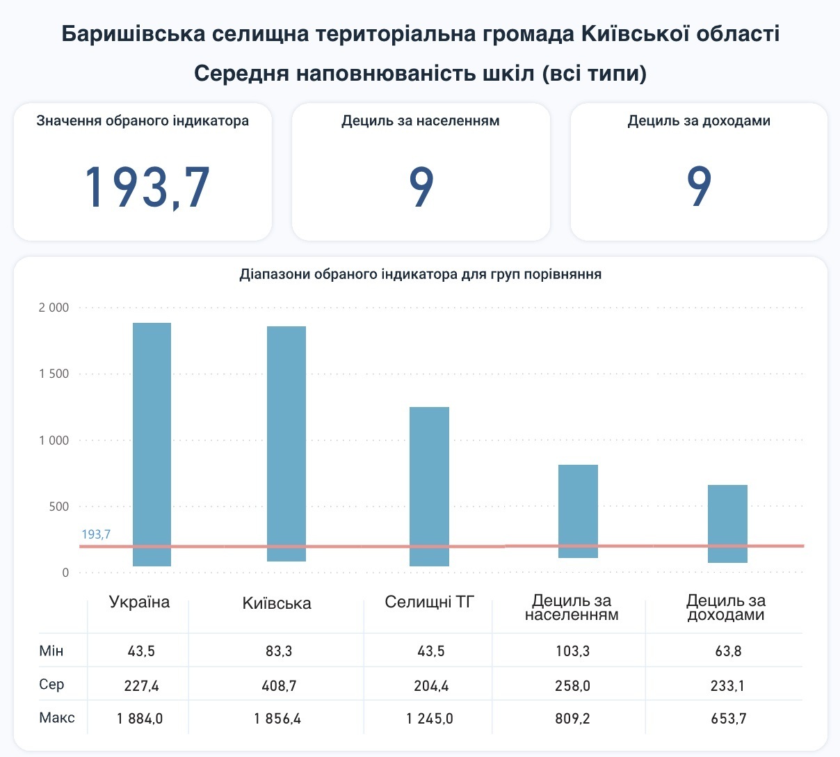 Так, зверху відображене значення індикатора в середньому. Тобто середня наповнюваність шкіл у країні складає 227,4 учня у 2023–2024-му навчальному році. - 0,8 % – це зміна, порівнюючи з попереднім роком. Цифра посередині – це мінімальне значення середньої наповнюваності – 43,5 учня. Мінімальне значення знизилося на 14,1 %. Тоді як максимальне значення – 1 884 учня – зросло на 3,4 %.