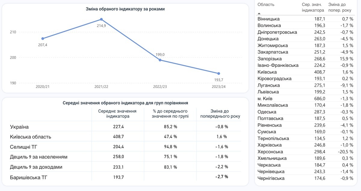 Знизу скриншоту є таблиця, яка демонструє середнє значення обраного індикатора для груп порівняння. А праворуч – таблиця, яка демонструє середнє значення за областями.