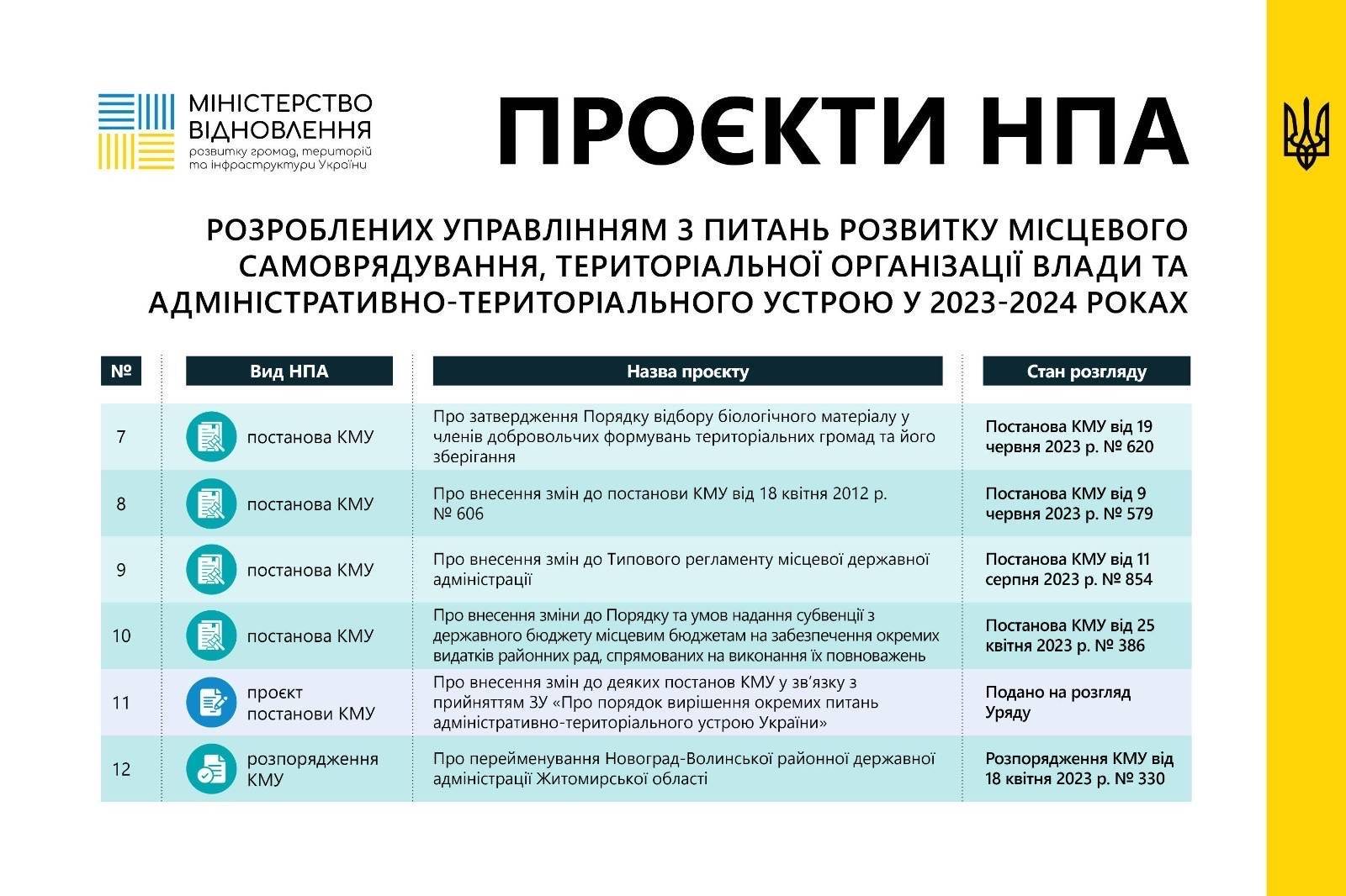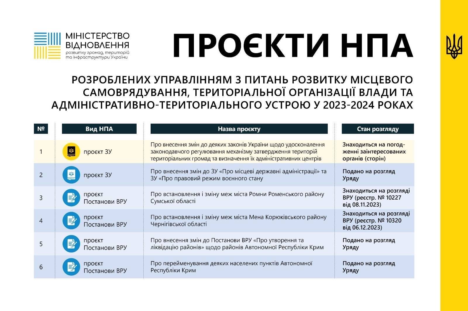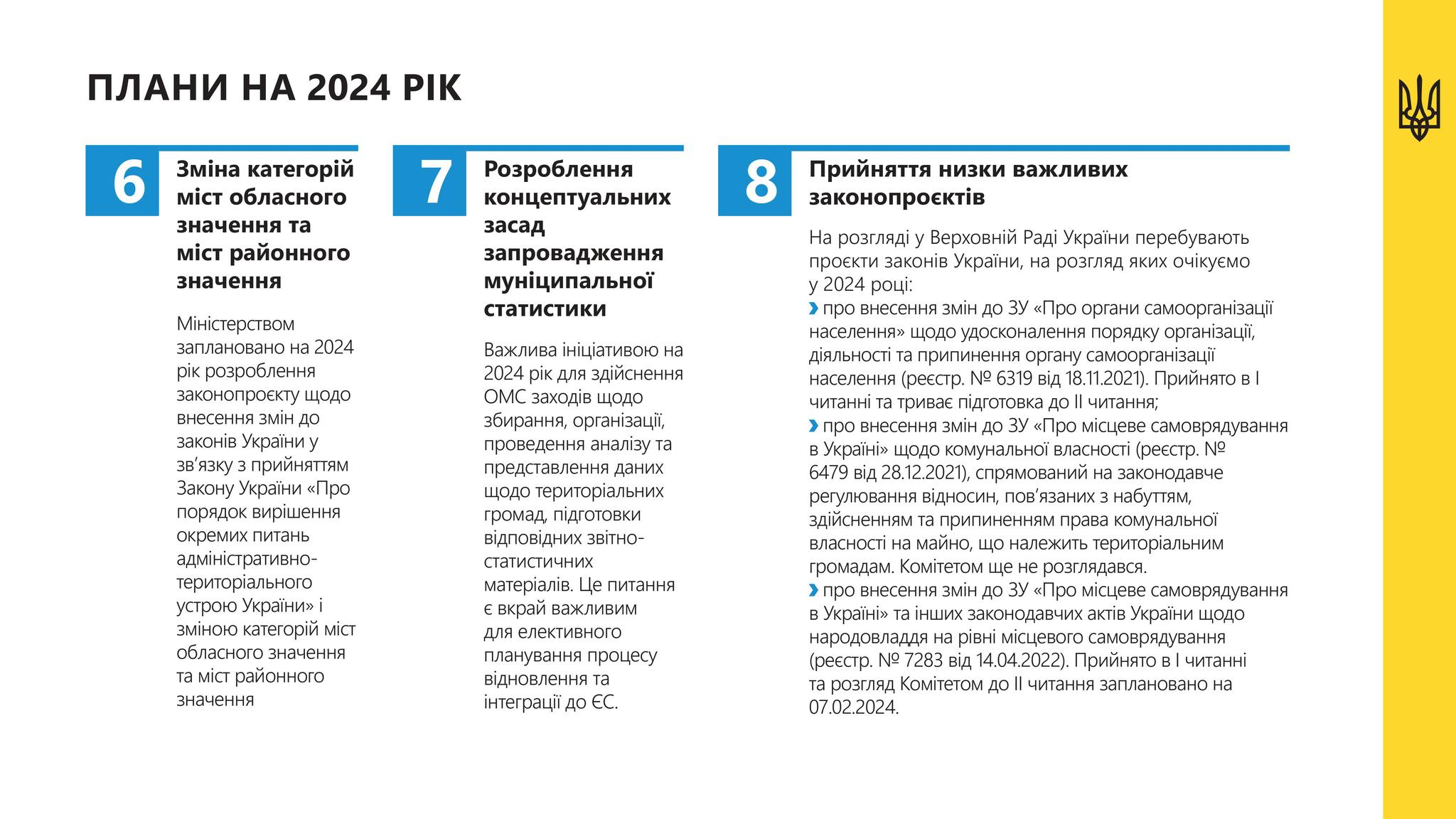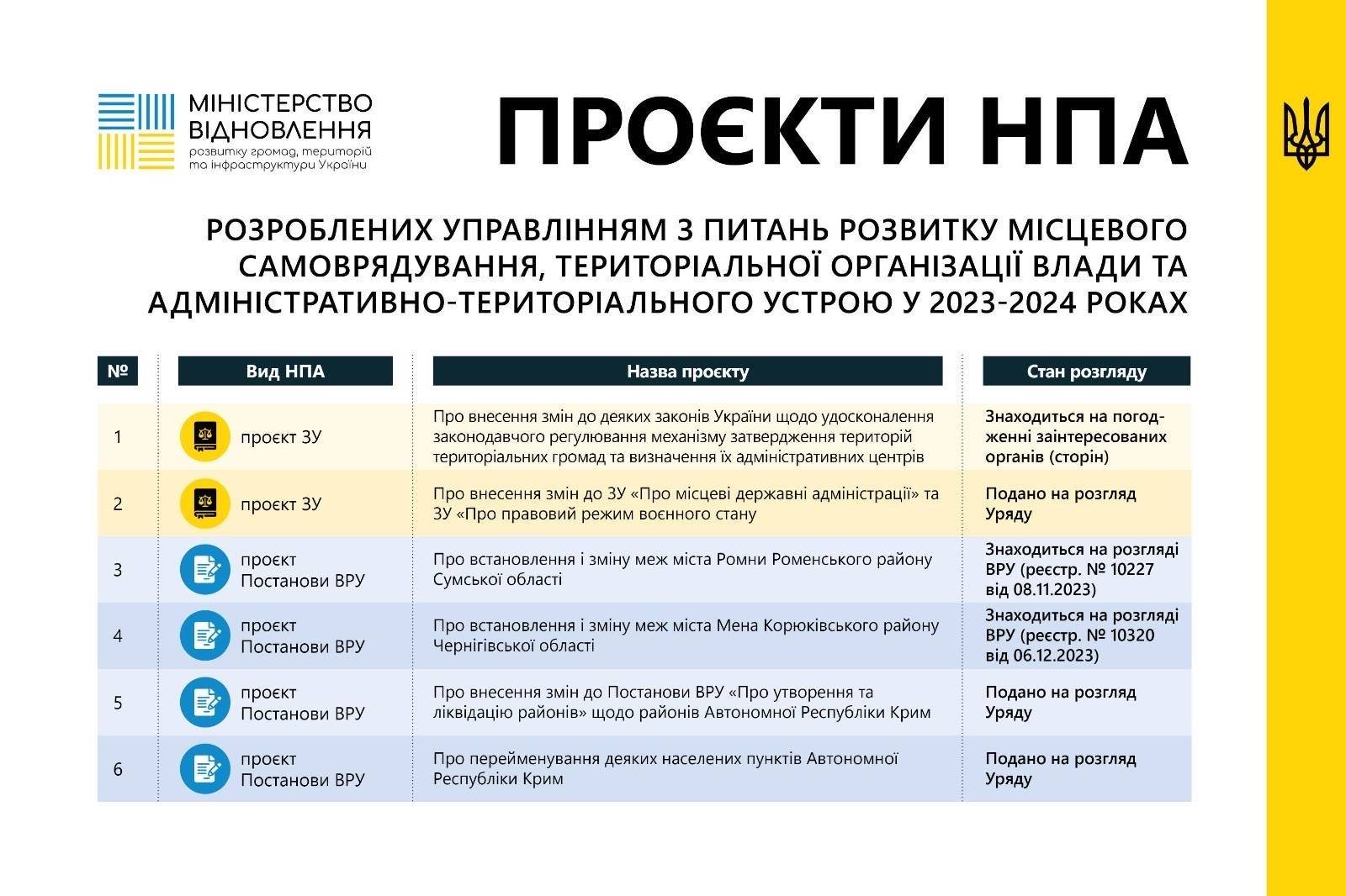 Також Міністерство працює над розробкою актів законодавства, які забезпечають подальше реформування органів місцевого самоврядування та виконання відповідних рекомендацій ЄС в Звіті про розширення (опублікованому 8 листопада 2023 року), та планує подати на розгляд законопроекти щодо: