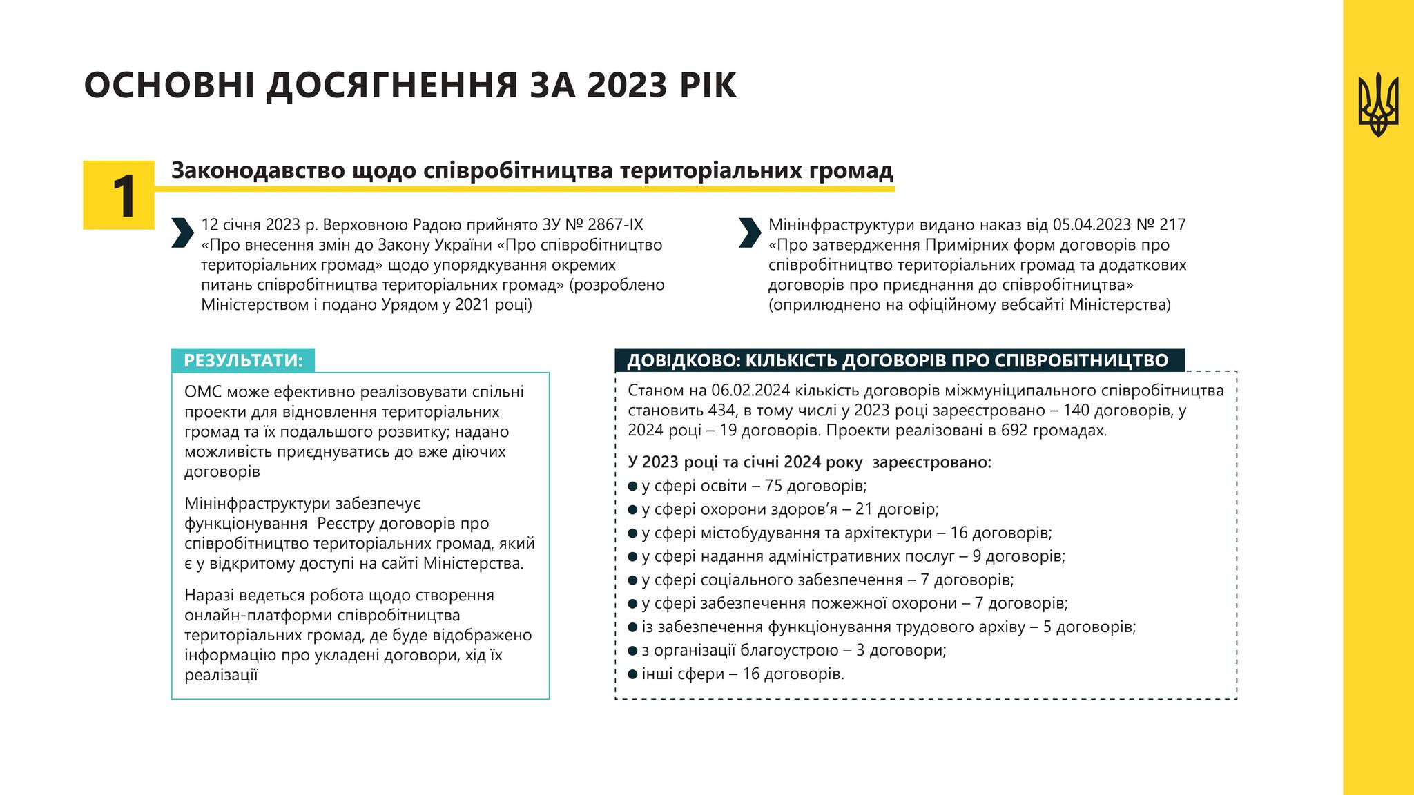- Ухвалено Закон України щодо упорядкування окремих питань співробітництва територіальних громад (№2867-ІХ), проєкт якого розроблено Міністерством, та прийнято наказ Мінінфраструктури “Про затвердження Примірних форм договорів про співробітництво територіальних громад та додаткових договорів про приєднання до співробітництва” на його виконання (№217).
