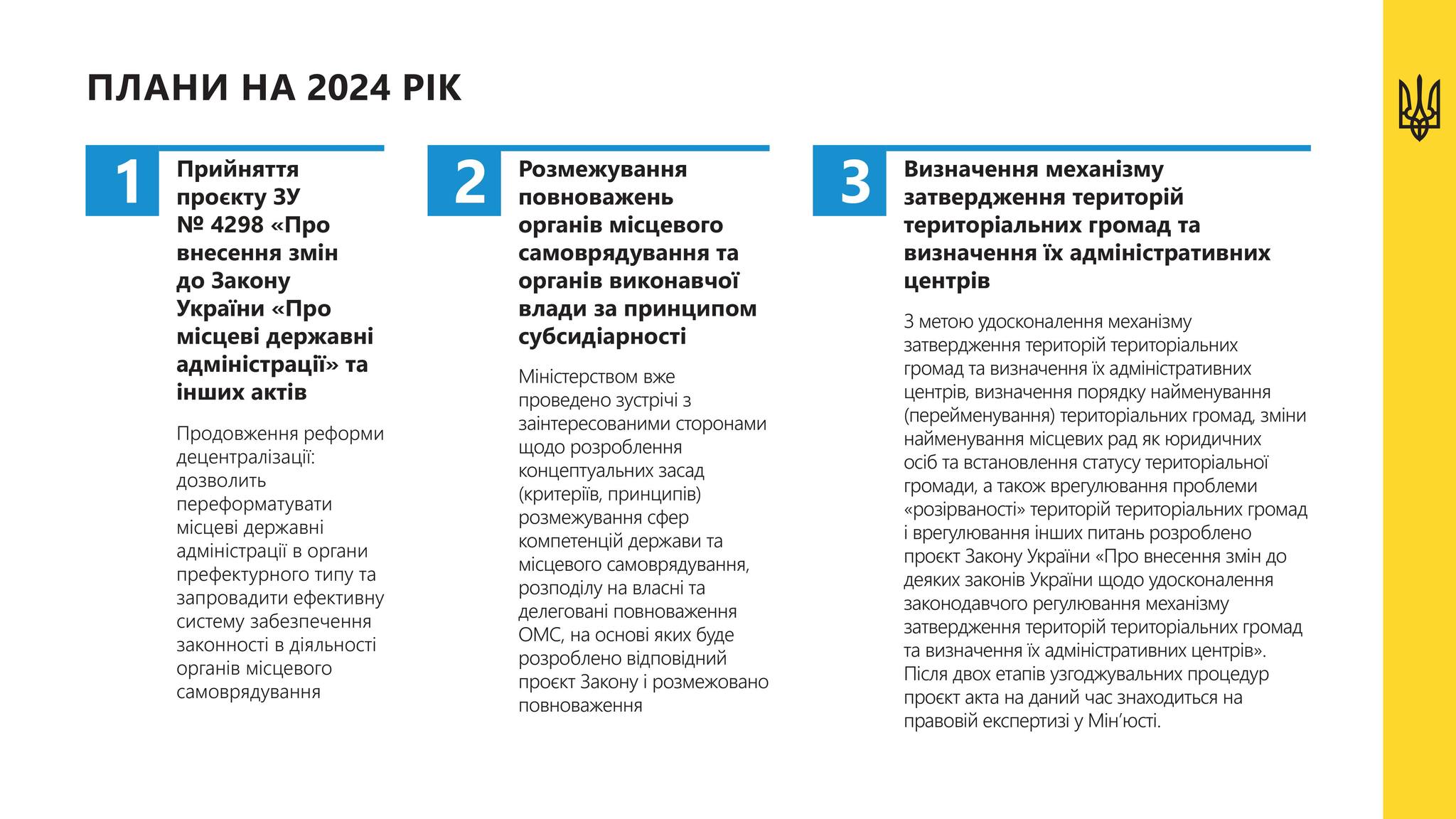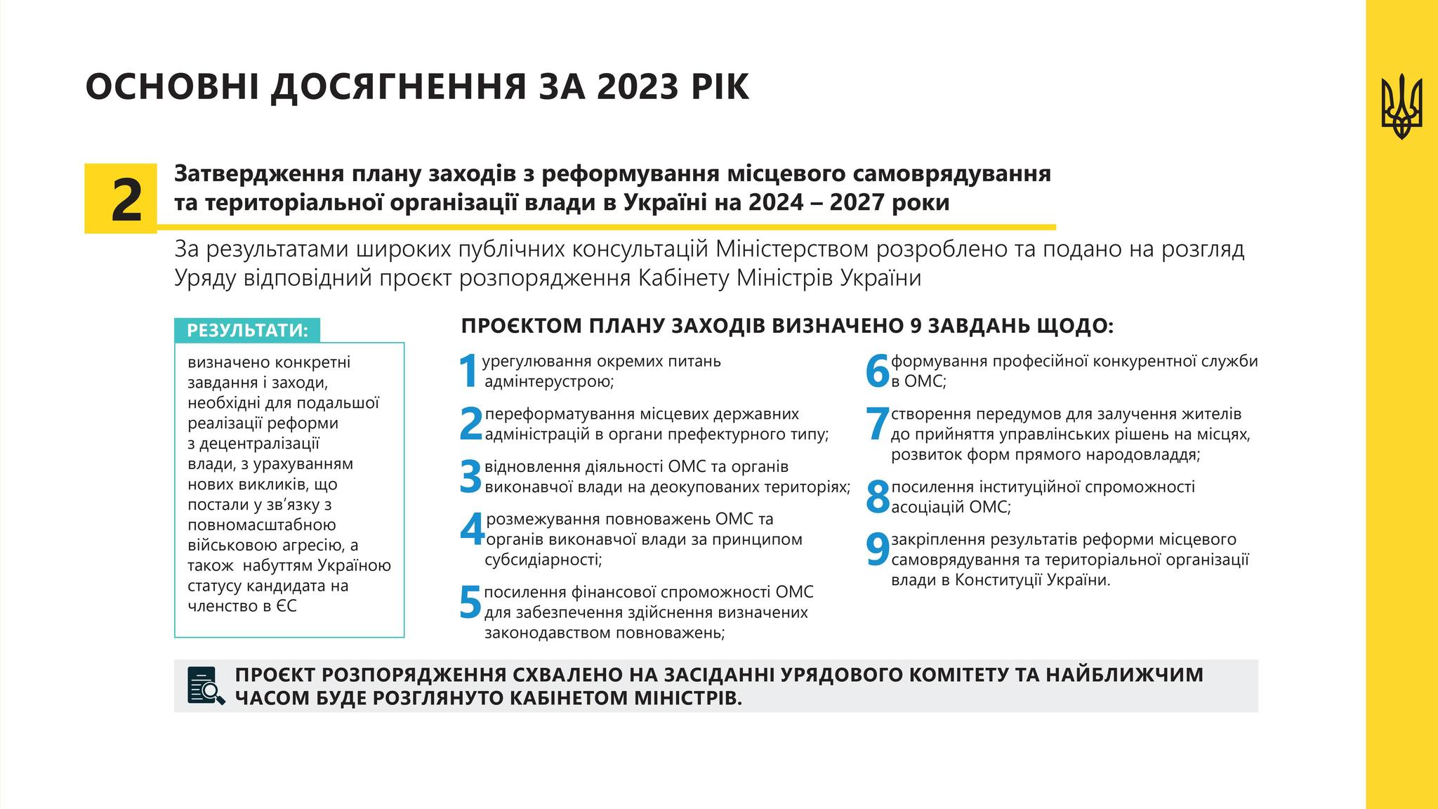 - Розроблено на подано на розгляд Уряду проєкт розпорядження про План заходів з реформування місцевого самоврядування та територіальної організації влади на 2024-2027 роки.