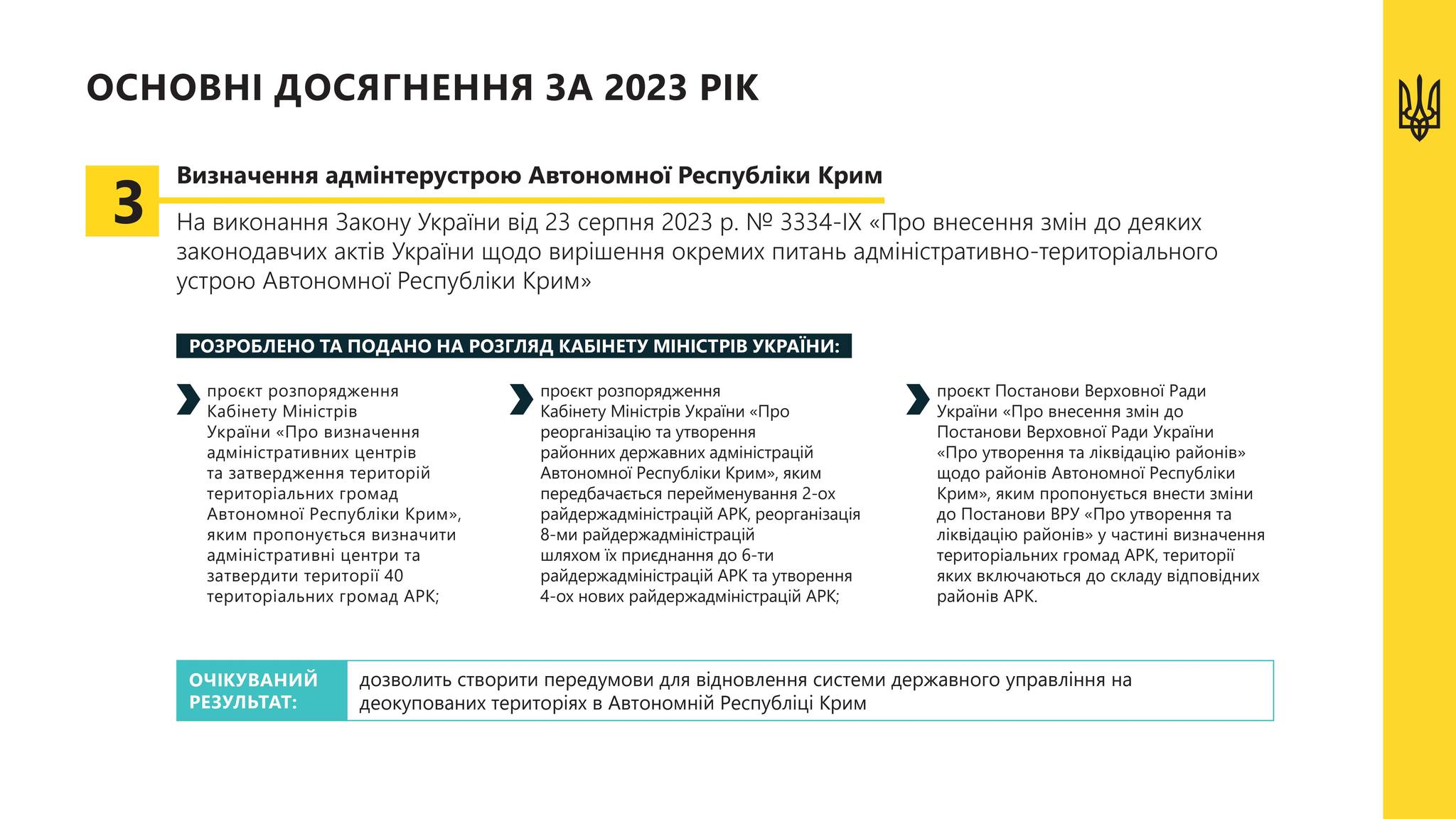 - Розроблено та подано на розгляд Уряду проєкти нормативно-правових актів, які спрямовані на відновлення держуправління на деокупованих територіях АРК, для виконання положень Закону України про внсення змін до деяких законодавчих актів України щодо вирішення окремих питань адміністративно-територіального устрою Автономної Республіки Крим (№3334 - IX).