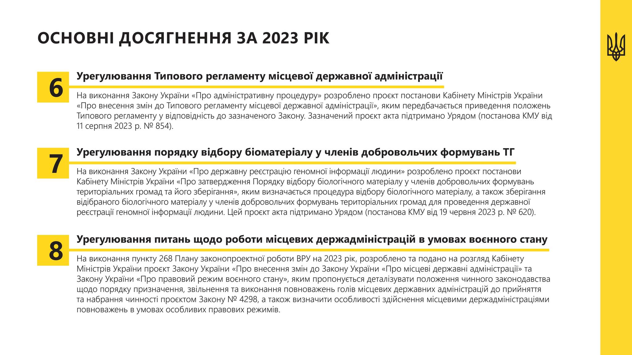 - На виконання Закону України про адміністративну процедуру розроблено проєкт постанови Кабінету Міністрів України про зміни до Типового регламенту місцевої державної адміністрації (проєкт підтримано урядом, постанова КМУ від 11 серпня 2023 р. №854).