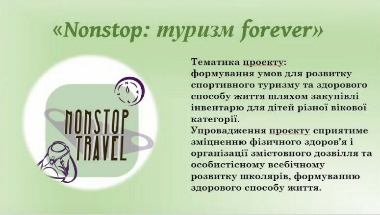 Інший проект-переможець, підготовлений також учнівською командою ліцею №5, передбачав придбання туристичного обладнання для центру позашкільної освіти, на базі якого функціонує туристичний гурток. Автори проекту «Nonstop: туризм forever” активно займаються туризмом з 9-го класу, тому проблема нестачі туристичного обладнання для них добре знайома. Отримавши нове обладнання, туристичний гурток провів заходи, що сприяли інтеграції внутрішньо переміщених осіб в громаді. Максим Дорош, співавтор проекту-переможця, учень 11-го класу ліцею №5, переконаний, що проекти, які об’єднують, допомагають адаптуватися в нових громадах, сприяють розвитку співпраці і є надзвичайно важливими в умовах воєнного стану.
