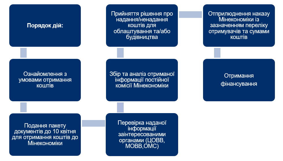 Обсяги фінансування: компенсації підлягають до 100% вартості витрат (без урахування податку на додану вартість) заявника на підключення та приєднання до інженерно-транспортних мереж.