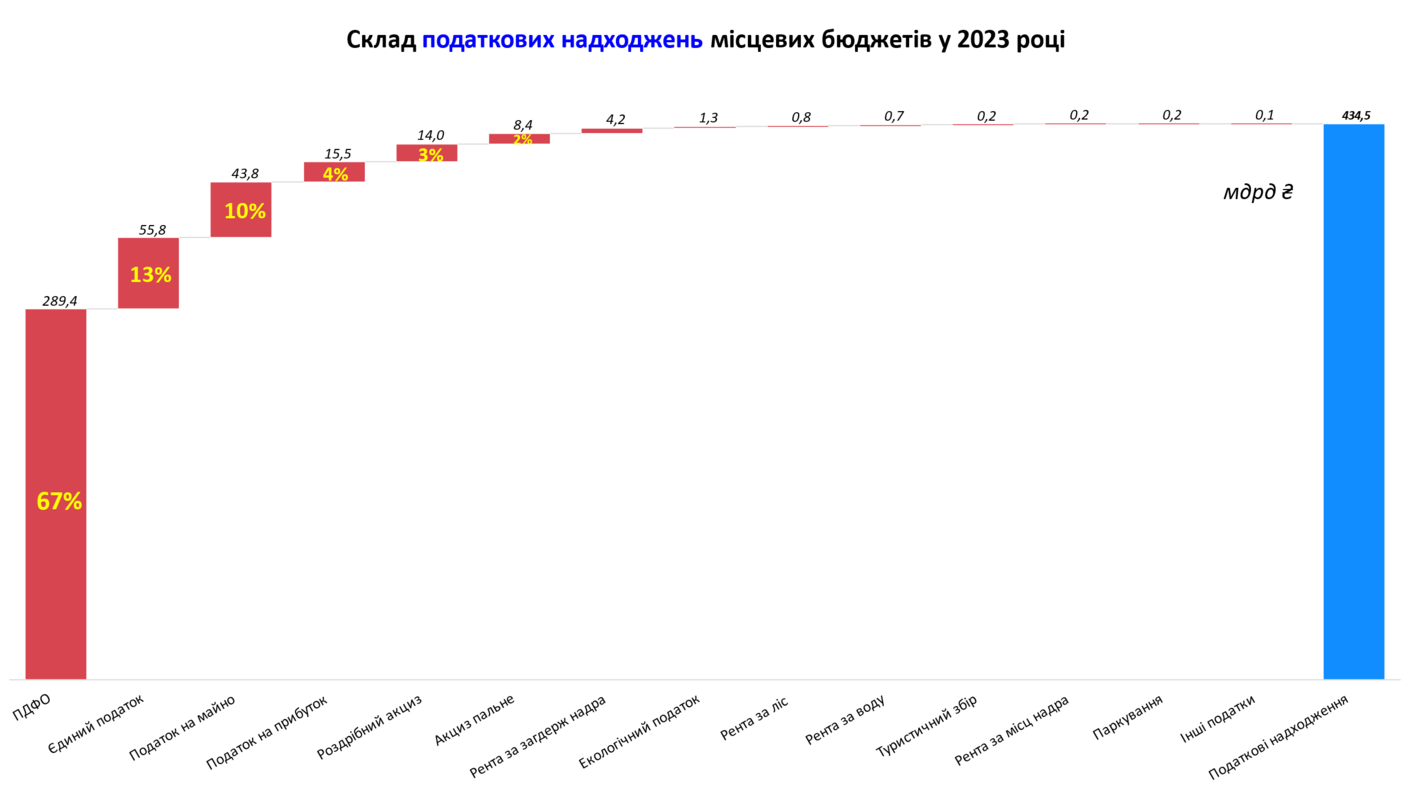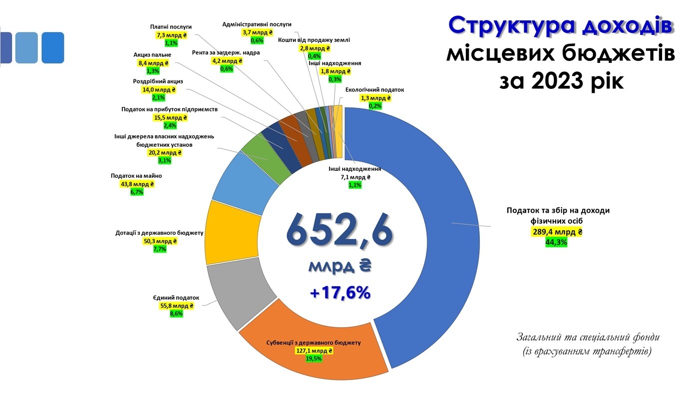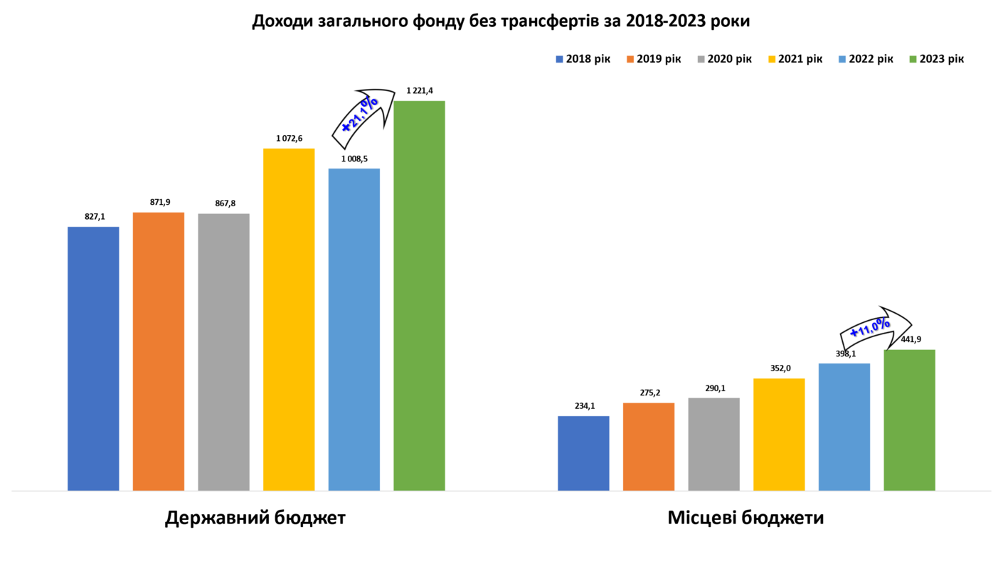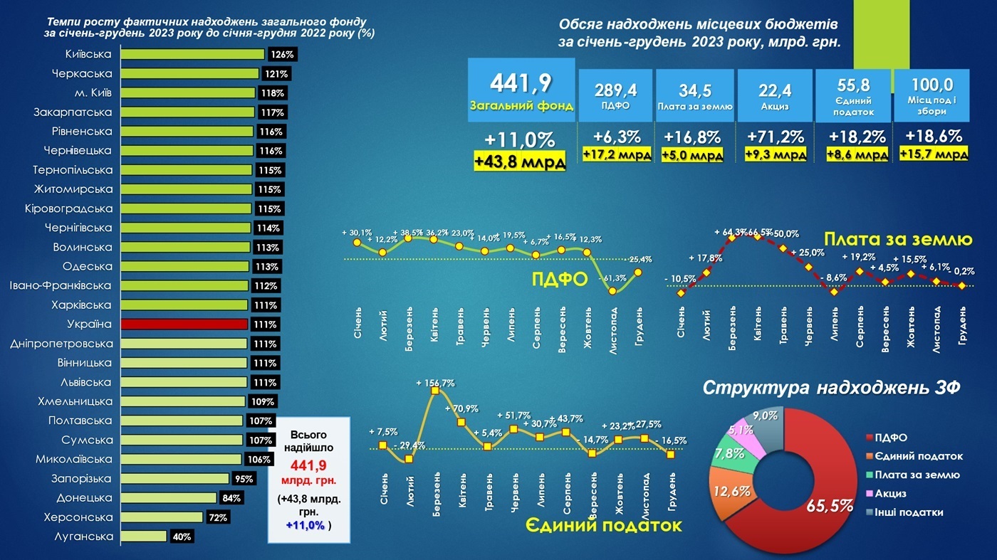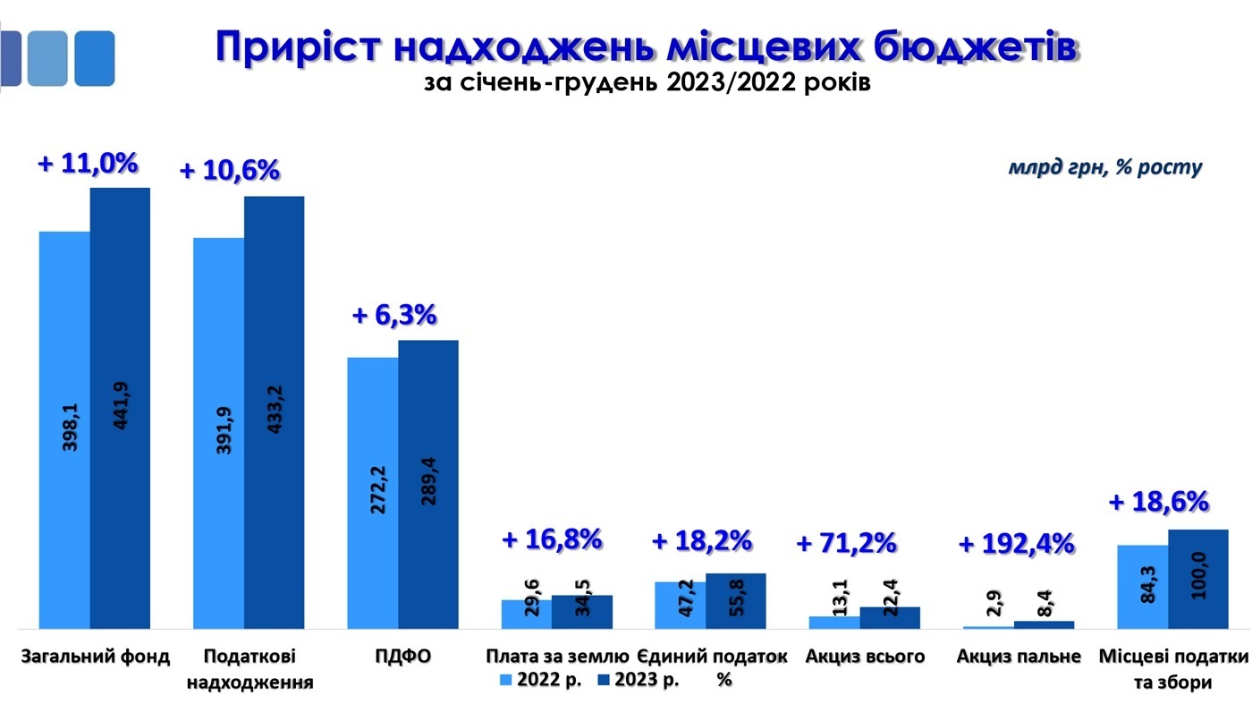Загалом за січень-грудень 2023 року до загального фонду місцевих бюджетів (без урахування міжбюджетних трансфертів) надійшло 441,9 млрд грн, що становить +11,0% або +43,8 млрд грн приросту проти січня-грудня 2022 року. Це в основному зумовлено ростом податку з доходів фізичних осіб (+6,3% або +17,2 млрд грн), загальний ріст по майнових податках склав +7,0 млрд грн, а приріст акцизу з пального слав +5,5 млрд грн, в порівнянні із 2022 роком.