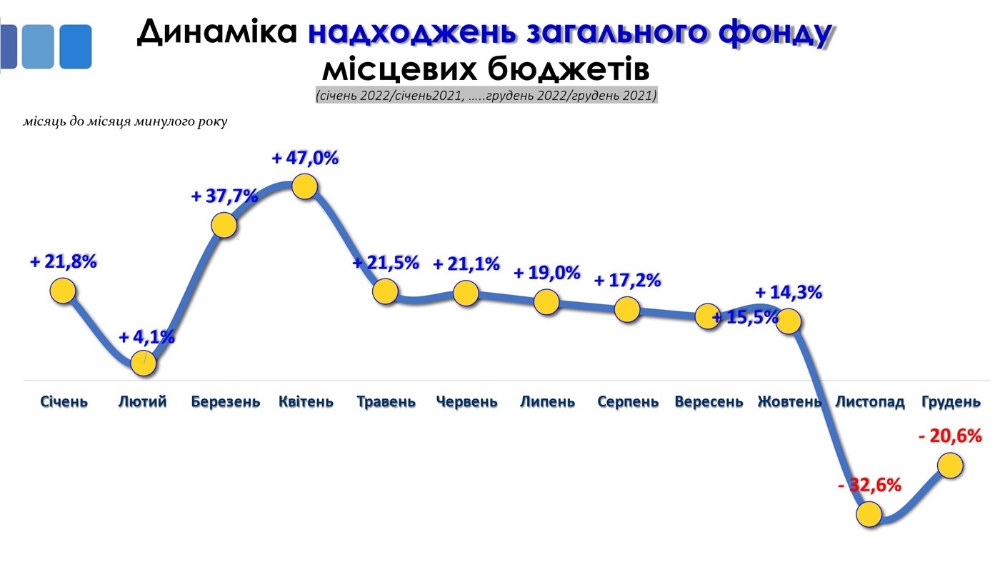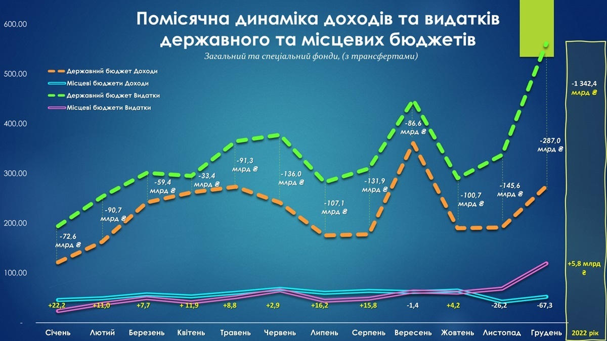 Приріст по місцевих бюджетах був від’ємним лише у вересні (-1,4 млрд грн), листопаді (-26,2 млрд грн) та грудні (-67,3 млрд грн), що зумовлено вилученням військового ПДФО, по решті місяців приріст був додатнім, зокрема, у січні доходи перевищували видатки на 22,2 млрд грн.