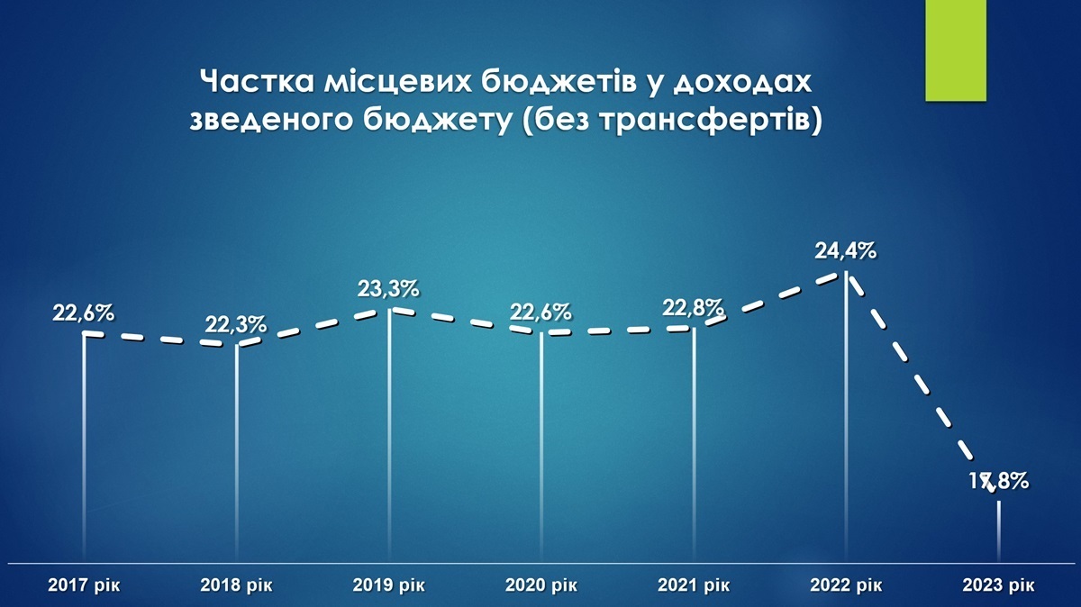 Разом з цим, зважаючи на значний приріст надходжень до державного бюджету та вилучення з 1 жовтня 2023 року податку на доходи фізичних осіб з грошового забезпечення, грошових винагород та інших виплат, одержаних військовослужбовцями та особами рядового і начальницького складу, частка доходів місцевих бюджетів у доходах зведеного бюджету впала з 24,4% у 2022 році до 17,8% у 2023 році, що є нижчим рівня 2015 року та дорівнює показнику 2011 року.