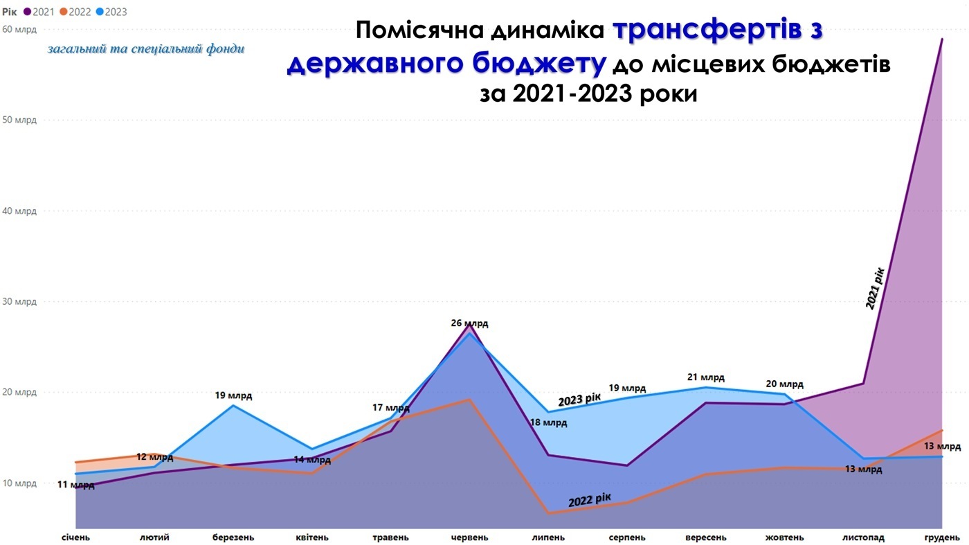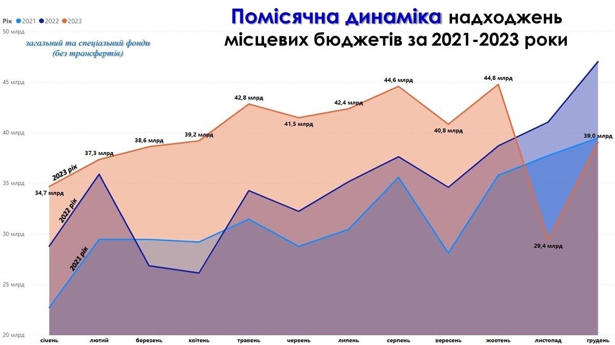 Якщо розглядати помісячну динаміку надходжень до місцевих бюджетів за 2021-2023 роки, помітним є значне зниження надходжень у 2022 році, починаючи з березня через повномасштабне вторгнення, але вже в травні показники відновились вище рівня довоєнного 2021 року. Громади показали свою стійкість, фінансову автономію та стабільність у фінансуванні публічних послуг. Публічне управління на місцевому рівні та виконання всіх повноважень (як власних так і делегованих) було забезпечено ефективними управлінськими рішеннями на місцях завдяки децентралізації.
