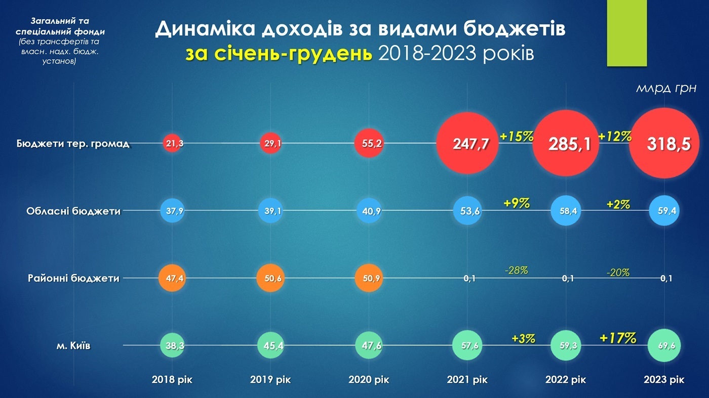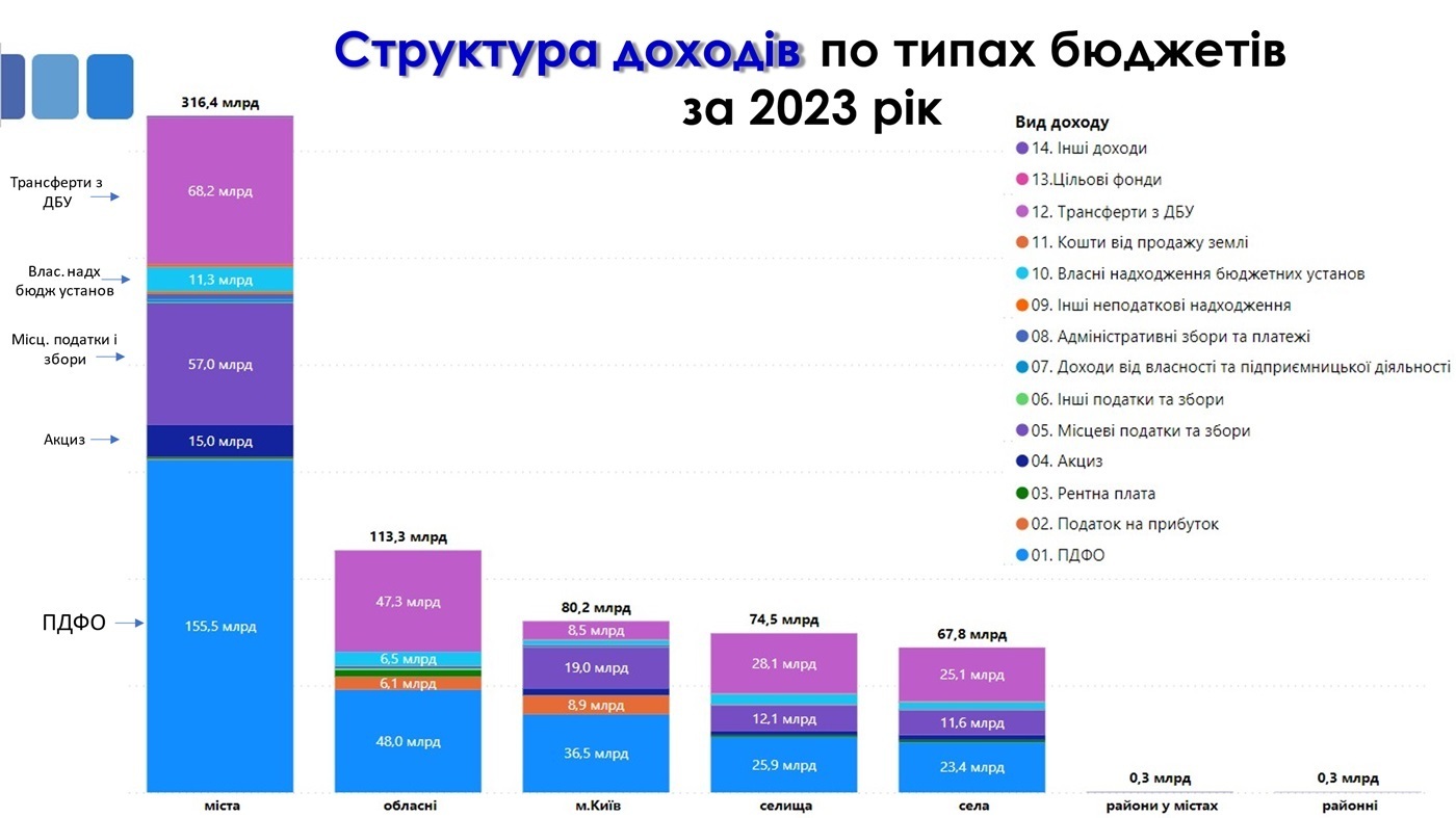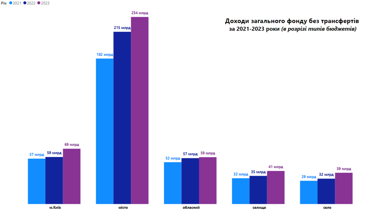 Розглядаючи приріст доходів місцевих бюджетів в розрізі типів місцевих бюджетів, помітними є значні надходження міст та столиці. Так обсяг надходжень до загального фонду без трансфертів (фактично власні доходи) бюджету міста Києва перевищує сукупні доходи всіх обласних бюджетів та знаходиться на рівня всіх сукупних доходів сіл та селищ України. При цьому, бюджет міста Києва не бере участі у вирівнюванні податкоспроможності місцевих бюджетів. Приріст надходжень по містах у 2023 році, порівняно із 2021 роком, склав +28,6%, по Києву +21,8%, по селищах +28,2%, по селах +34,5%.