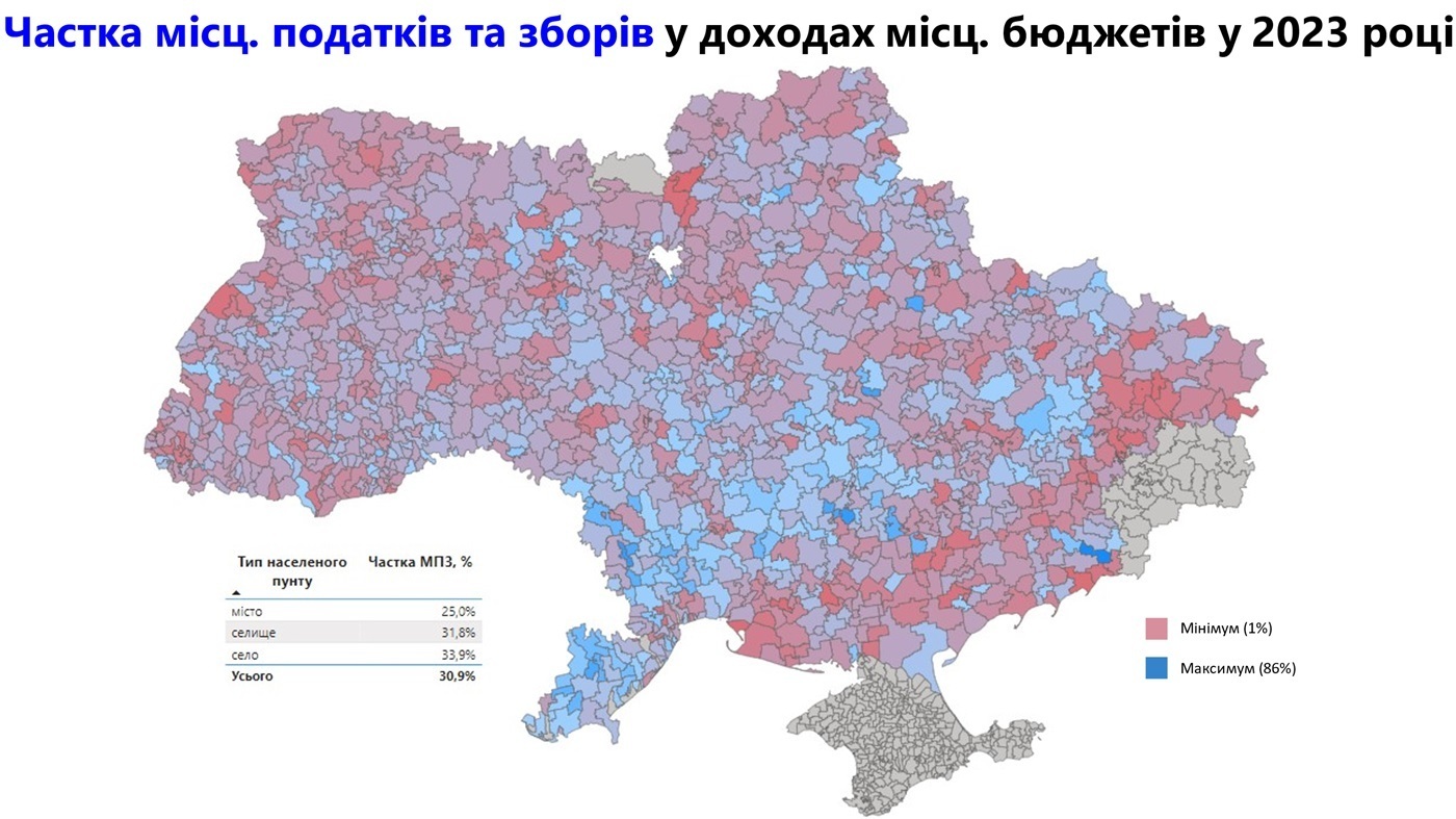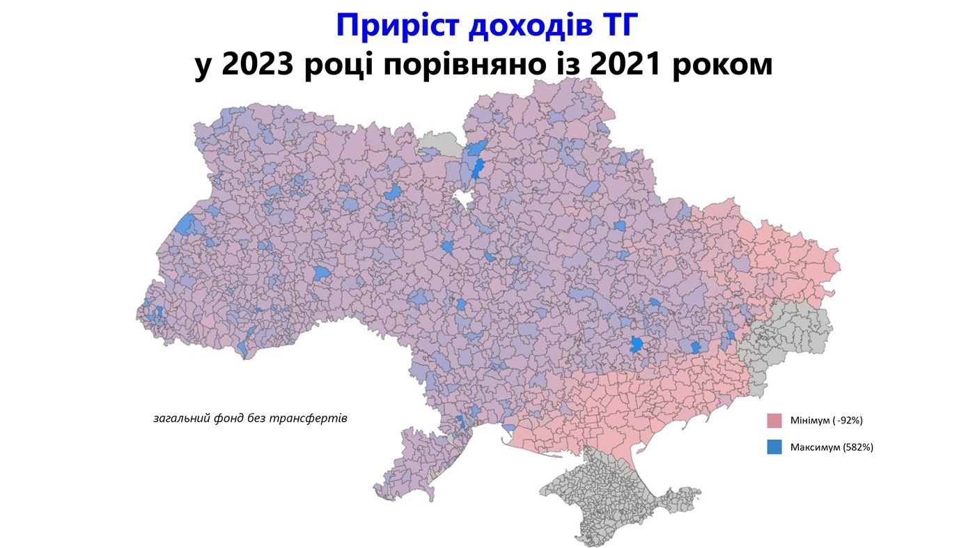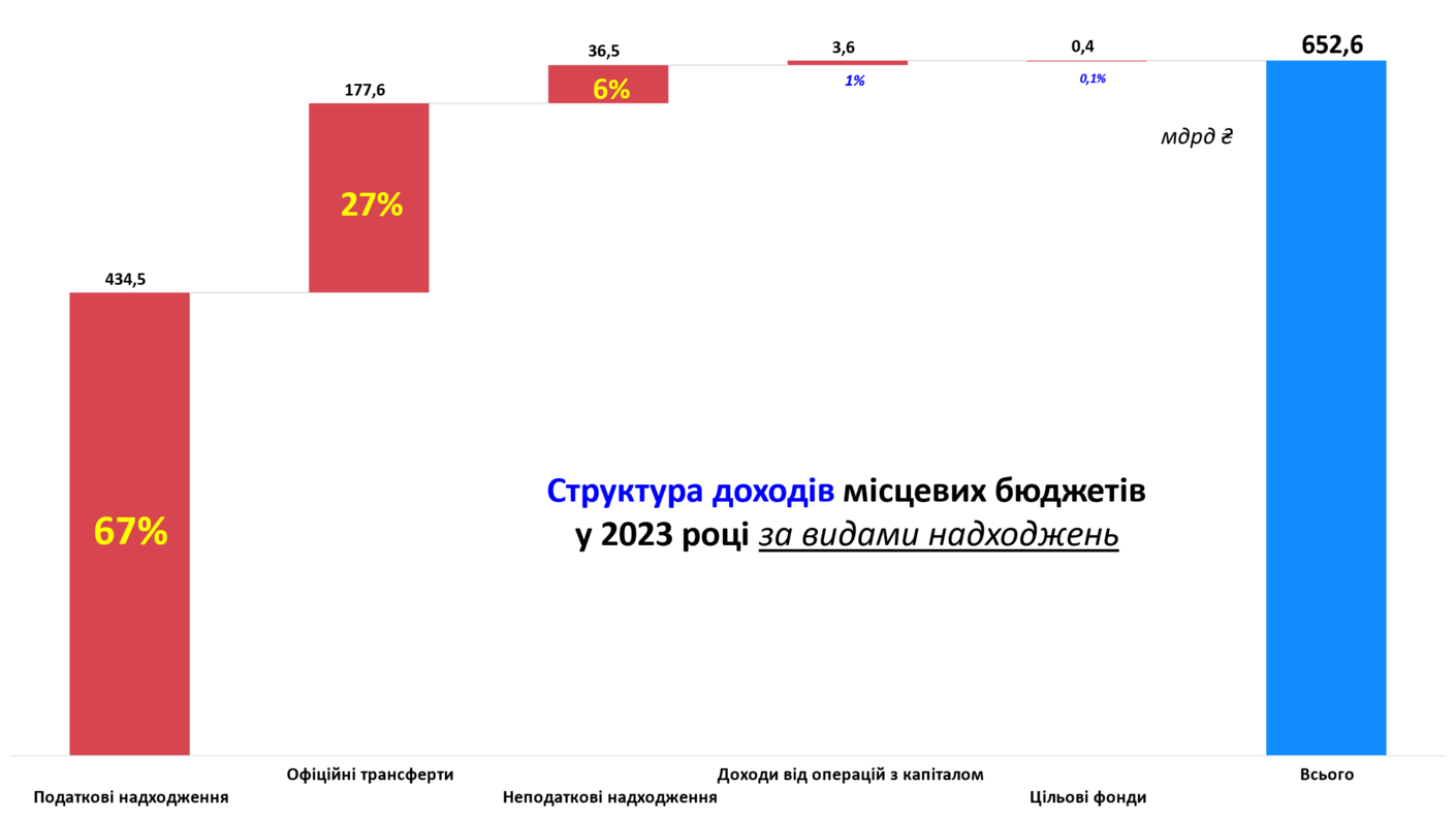 Розглядаючи приріст доходів місцевих бюджетів в розрізі типів місцевих бюджетів, помітними є значні надходження міст та столиці. Так обсяг надходжень до загального фонду без трансфертів (фактично власні доходи) бюджету міста Києва перевищує сукупні доходи всіх обласних бюджетів та знаходиться на рівня всіх сукупних доходів сіл та селищ України. При цьому, бюджет міста Києва не бере участі у вирівнюванні податкоспроможності місцевих бюджетів. Приріст надходжень по містах у 2023 році, порівняно із 2021 роком, склав +28,6%, по Києву +21,8%, по селищах +28,2%, по селах +34,5%.