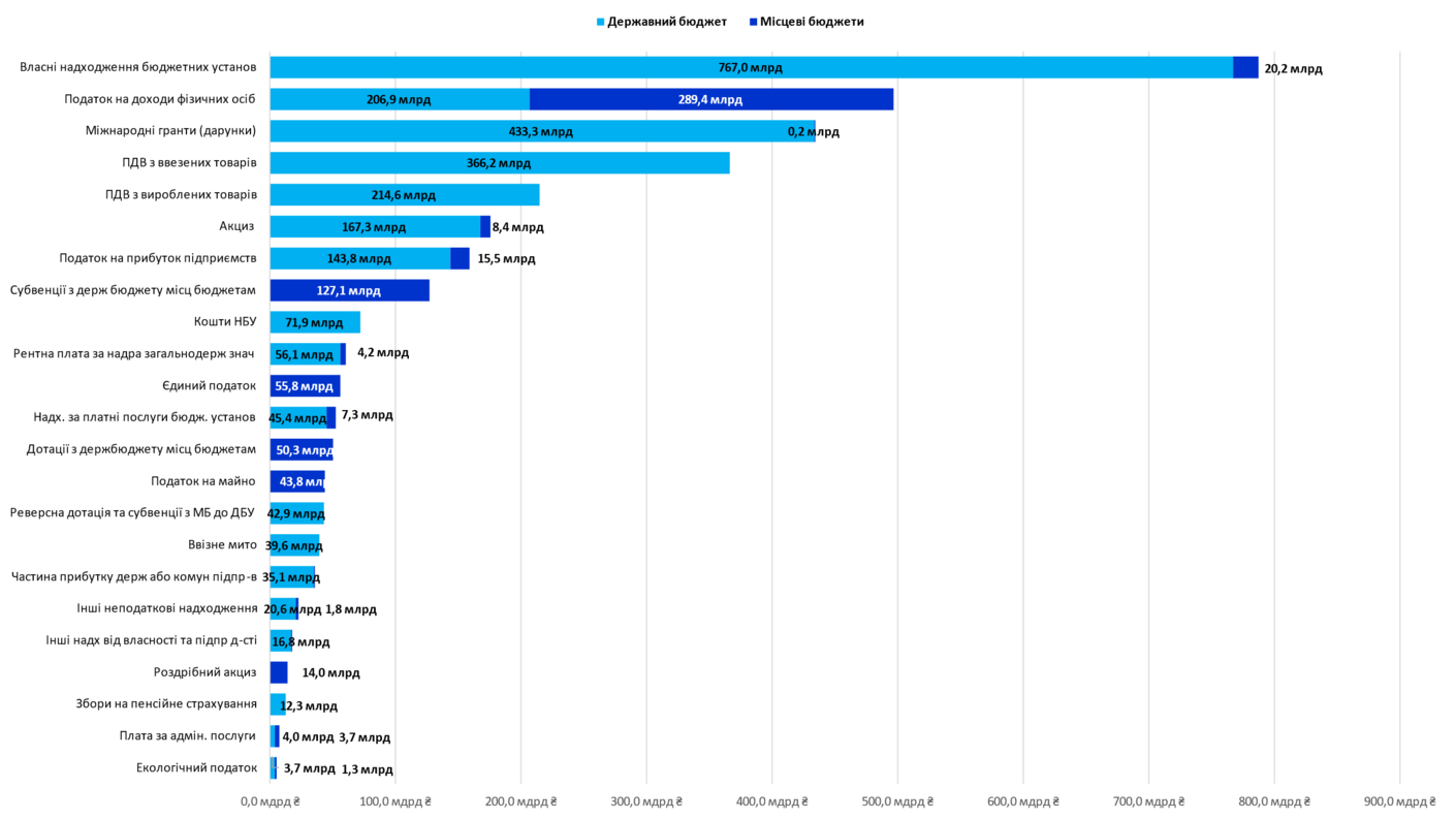 Розглядаючи найбільші за обсягами надходження до державного та місцевих бюджетів, помітним є значне зростання власних надходжень бюджетних установ (787,2 млрд грн), які у 2023 році перевищили ПДФО, міжнародні гранти, ПДВ, акциз та податок на прибуток, які є ключовими надходженнями. Це вперше неподаткове джерело надходжень перевищило основні податкові надходження. Вагомими надходженнями для місцевих бюджетів залишається ПДФО, єдиний податок, майнові податки, роздрібний акциз.