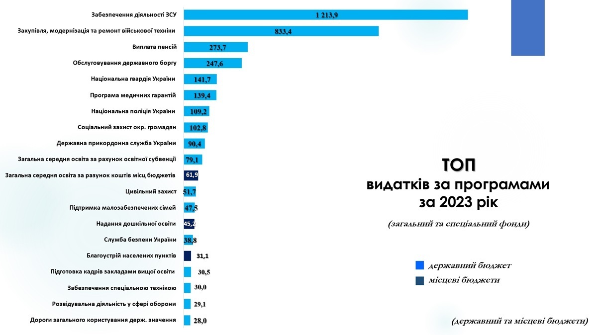 При цьому, найбільше коштів з державного та місцевих бюджетів витрачається на Збройні Сили України, виплату пенсій та обслуговування боргу. Нижче відображено найбільші за обсягами видатки за бюджетними програмами за січень-грудень 2023 року (із розподілом між державним та місцевими бюджетами). Варто звернути увагу, наскільки загальна середня освіта дофінансовується з місцевих бюджетів (майже паритетно).
