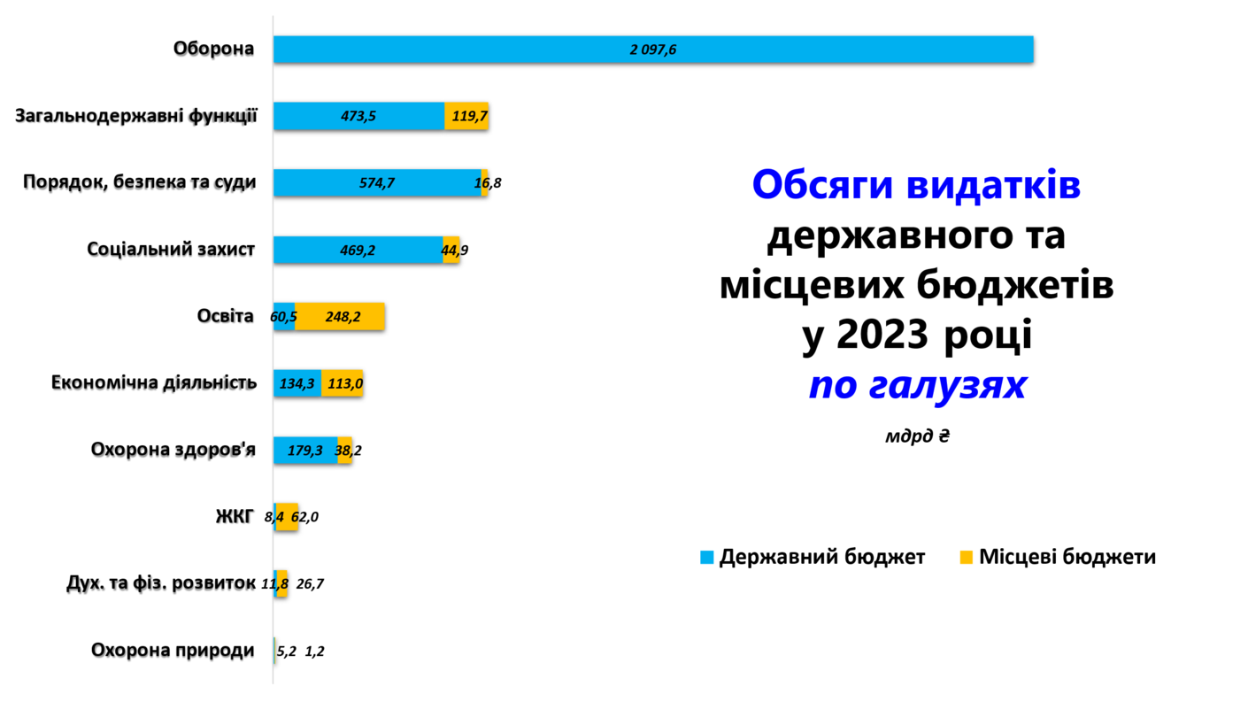Звісно, в галузевому розрізі найбільшим є обсяг видатків на національну оборону, яка, відповідно до вимог бюджетного законодавства, фінансується виключно з державного бюджету. У 2023 році видатки на оборону склали 45% видатків зведеного бюджету України. За цією статтею видатків слідує соціальне забезпечення та загальнодержавні функції. Житлово-комунальне господарство в повній мірі забезпечується за рахунок власних коштів місцевих бюджетів. Найбільшим напрямом фінансування з місцевих бюджетів залишається «Освіта» як делеговане повноваження. Крім цього, у 2023 році значно зросли видатки на громадський порядок, безпеку та судову систему (591,5 млрд грн або 12,6% від усіх видатків зведеного бюджету України).