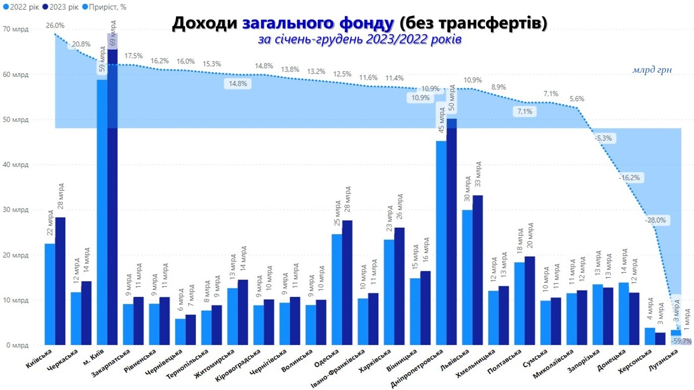 У розрізі областей найвищий ріст доходів загального фонду (без трансфертів) продемонстрували Київська (+26,0%), Черкаська (+20,8%), Закарпатська (17,5%) області та м. Київ (+17,6%). Не забезпечено приріст доходів по загальному фонду (без трансфертів) по 4-х областях: Луганській (-59,7%), Херсонській (-28,0%), Донецькій (-16,2%) та Запорізькій (-5,3%).