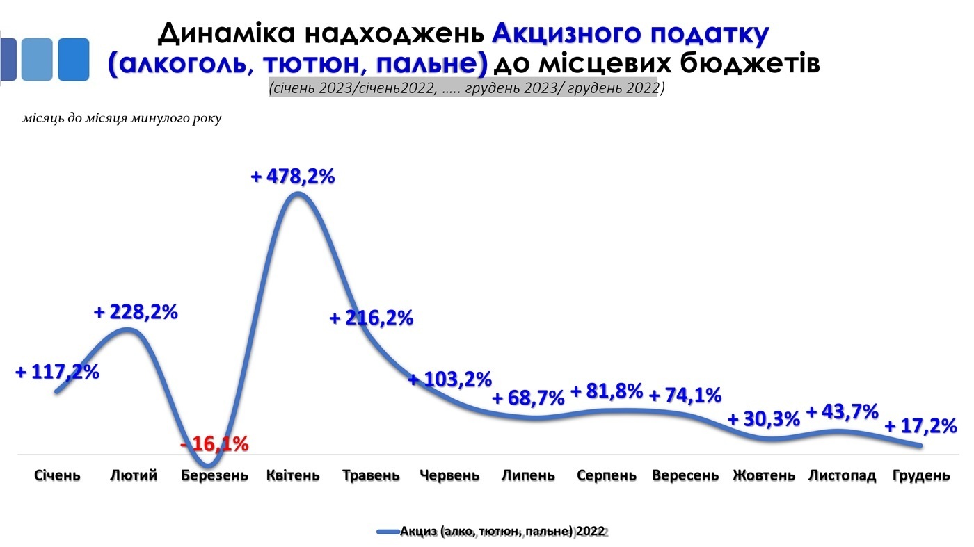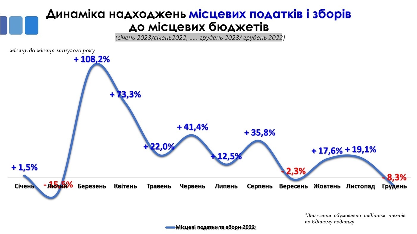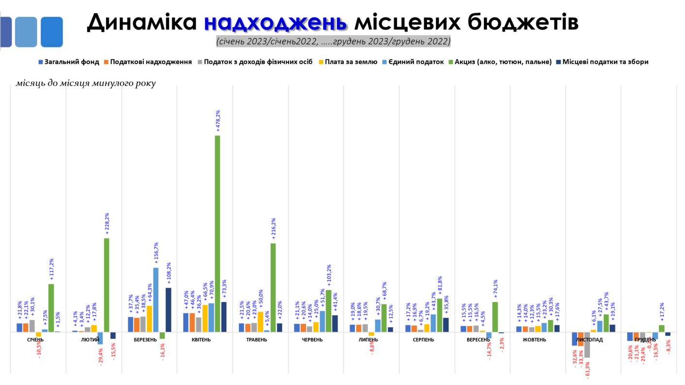Ріст по місцевих бюджетах зумовлений зростанням надходжень податку із доходів фізичних осіб (+6,3% або +17,2 млрд грн), єдиного податку (+18,2% або +8,6 млрд грн), акцизного податку (+63,3% або +8,0 млрд грн) та податку на майно (+19,1% або +7,0 млрд грн).