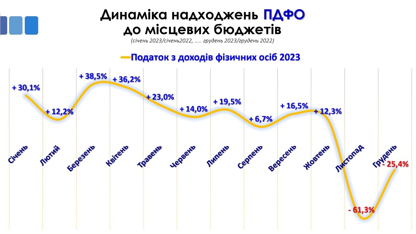 Надходження податку з доходів фізичних осіб до місцевих бюджетів протягом січня-жовтня 2023 року знаходились в додатному значенні. Це зумовлено, по-перше, зростанням відрахувань із заробітних плат військовослужбовців, по-друге, свою роль відіграло збільшення нормативу зарахування ПДФО до місцевих бюджетів - з 60% до 64% з початку 2022 року. Але Законом України від 08.11.2023 3428-IX «Про внесення змін до Бюджетного кодексу України щодо забезпечення підтримки обороноздатності держави та розвитку оборонно-промислового комплексу України» ПДФО з військових та осіб начальницького складу з 1 жовтня 2023 року було вилучено з місцевих бюджетів, що негативно вплинуло на приріст цього загальнодержавного податку в листопаді-грудні 2023 року.