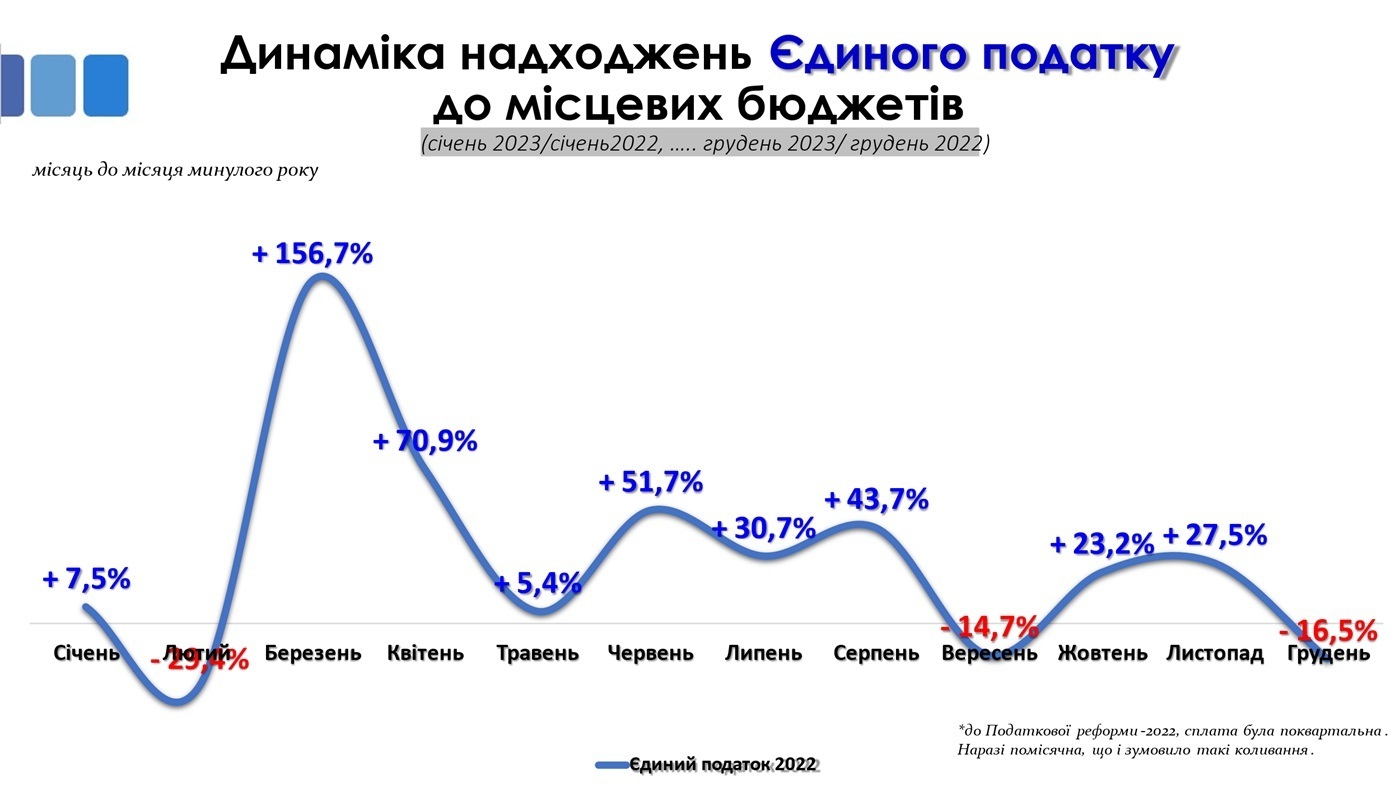 Приріст надходжень єдиного податку у січні-грудні 2023 року коливався (від росту +156,78% до падіння -16,5%). Цьому слугували зміни до податкового законодавства. По-перше, з 1 серпня 2023 року Законом України від 30.06.2023 № 3219-IX скасовано спеціальну ставку Єдиного податку для ФОПів 3-ї групи (2%).
