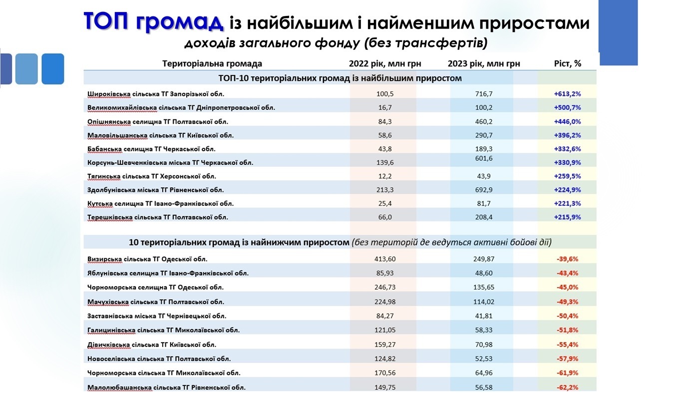 Громади, де не велися бойові дії, змогли гідно прийняти внутрішньо-переміщених осіб, забезпечити їх належною інфраструктурою та наданням публічних послуг на відповідному рівні. Крім цього, надходження до місцевих бюджетів в громадах, які не постраждали від військової агресії росії, дозволили наповнювати єдиний казначейський рахунок в умовах війни. І навіть з урахуванням значних податкових пільг громади зуміли наповнювати свої бюджети на рівні вище минулого року і відновити зростання.