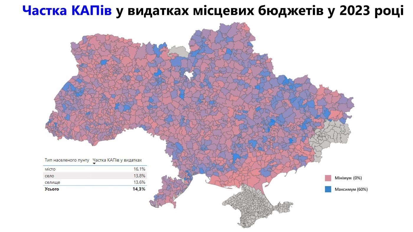 Доцільно також розглянути частку капітальних видатків у структурі видатків в розрізі територіальних громад. Очевидно, що показники в розрізі громад по Україні суттєво відрізняються: від 1% до 60% (тобто більше половини видатків). Так, Черкаська селищна територіальна громада Дніпропетровської області у 2023 році спрямувала 60% свої видатків на капітальні видатки (нагадаю, що Мінфін додатково, ще виділив більше 200 млн грн додаткової бюджетної підтримки для зазначеної громади). Дачненська сільської територіальної громади Одеської області спрямувала 57% свої видатків на капітальні видатки. Любимівська сільська територіальна громада спрямувала 56% свої видатків на капітальні видатки. При цьому, багато територіальних громад не проводили у 2023 році жодних капітальних видатків.