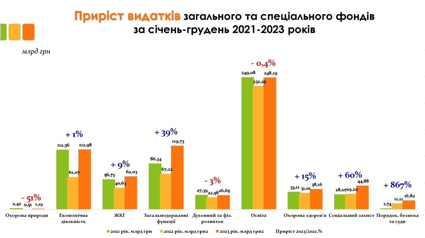 Очевидно, що в умовах війни найбільший відносний приріст зазнали видатки на громадський порядок, безпеку та судову систему. Для об’єктивного порівняння будемо відображати співвідношення показників 2023 року до довоєнного 2021 року. Так видатки на порядок, безпеку та суди зросли більш ніж в 9 раз. Також зросли видатки на соціальний захист (+90% або +16,8 млрд грн). У свою чергу, видатки в галузі освіти не відновили рівень 2021 року, а видатки на охорону здоров’я все ж зазнали хоч і не значного, але зменшення 6% (-2,1 млрд грн) у 2022 році, але показали позитивний приріст у 2023 році, в порівнянні з 2021 роком. Найбільший відносний спад видатків у галузі охорони природи -51%, у 2022 році зниження було -79% (видатки зменшились з 2,4 млрд грн у 2021 році до 0,5 млрд грн у 2022 році та складали 1,2 млрд грн у 2023 році). При цьому, видатки на житлово-комунальне господарство та загальнодержавні функції значно зросли у 2023 році.