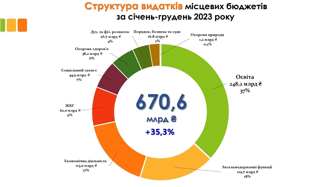 У структурі видатків найбільшу питому вагу займають видатки на освіту (37% всіх видатків або 248 млрд грн). Найменшу частку в розрізі функціональної класифікації видатків займають видатки на охорону природи (лише 0,2% або 1,2 млрд грн).