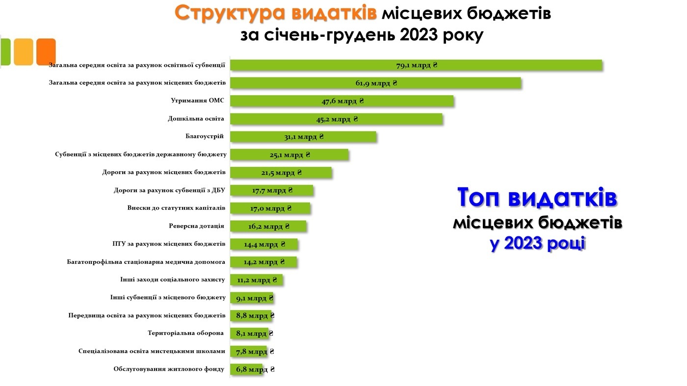 Розглянемо найбільші за обсягами фінансування видатки за програмною класифікацією видатків. На гістограмі нижче очевидним є наскільки місцеві бюджети дофінансовують загальну середню освіту. Чимало коштів було виділено також на утримання дошкільних навчальних закладів (45,2 млрд грн, 4 місце в рейтингу). При цьому, видатки на утримання апарату управління органів місцевого самоврядування займають третю сходинку із обсягом в 47,6 мільярдів грн. Чималим виявився обсяг коштів виділених місцевою владою на територіальну оборону – 8,1 мільярдів грн. При цьому, 25,1 млрд грн місцеві бюджети спрямували до державного бюджету, зокрема, на забезпечення та підтримку національної безпеки та оборони.