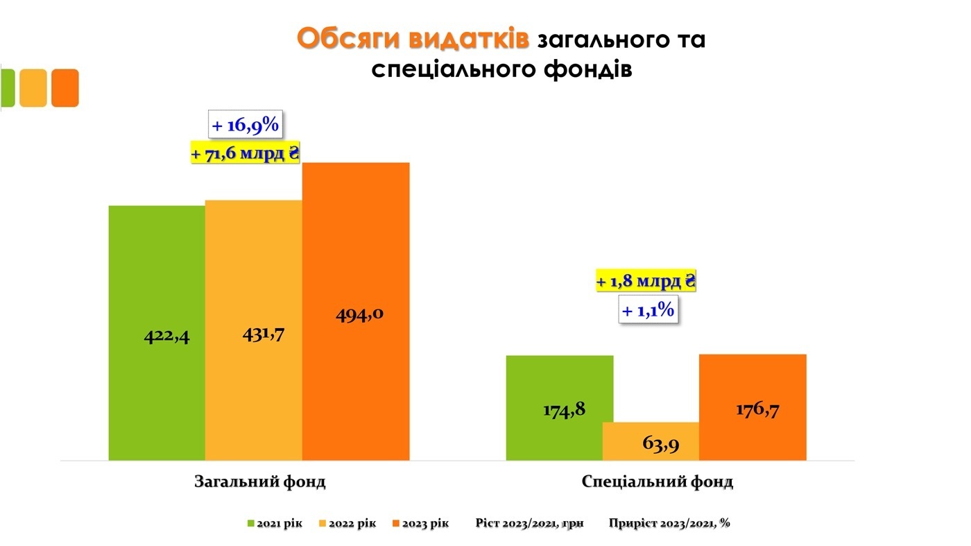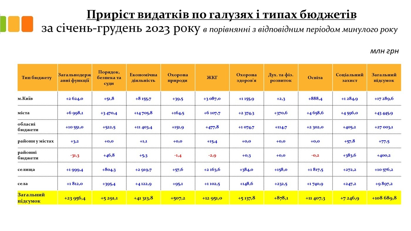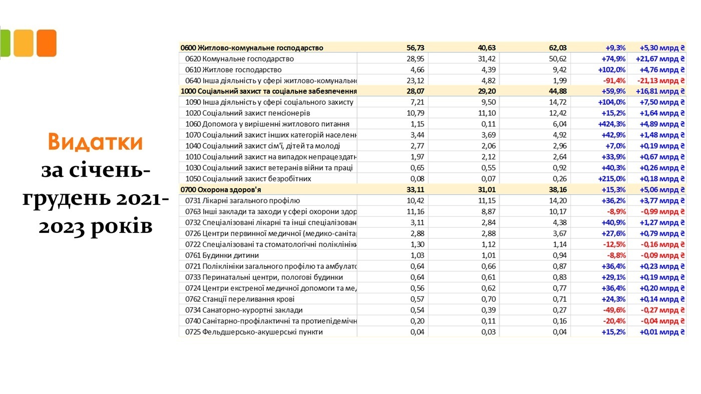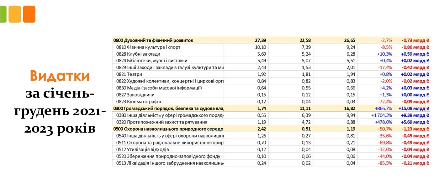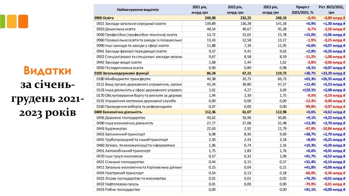 У таблицях нижче продемонстровано обсяги видатків по галузях у 2021-2023 роках і відсотковим приростом та абсолютним ростом у 2023 році порівняно із довоєнним 2021 роком. Якщо в минулому році були виключно від’ємні прирости, то у 2023 році по багатьох галузях прирости додатні. Але варто зважати, що показники не проіндексовані на інфляцію.