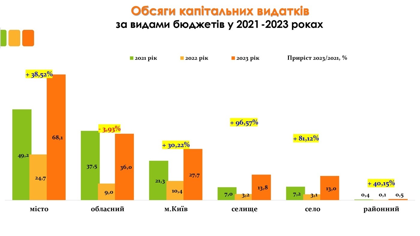 Розглянемо прирости капітальних видатків у розрізі типів бюджету. Наочно видно, що капітальні видатки у 2022 році були скорочені по всіх типах бюджетів. Але вже у 2023 році по всіх типах бюджетів спостерігається додатній приріст, порівняно з 2022 роком, та у всіх крім загального показника по обласних бюджетах додатній приріст у 2023 році, порівняно з 2021 роком. Найбільшими за обсягами у 2023 році були капітальні видатки міст у розмірі 68,1 млрд грн (або +38,5%, порівняно з 2021 роком). Найнижчим був абсолютний показник сіл (13,0 млрд грн). Капітальні видатки обласних бюджетів у 2023 році були на 3,9% меншими за рівень 2021 року.