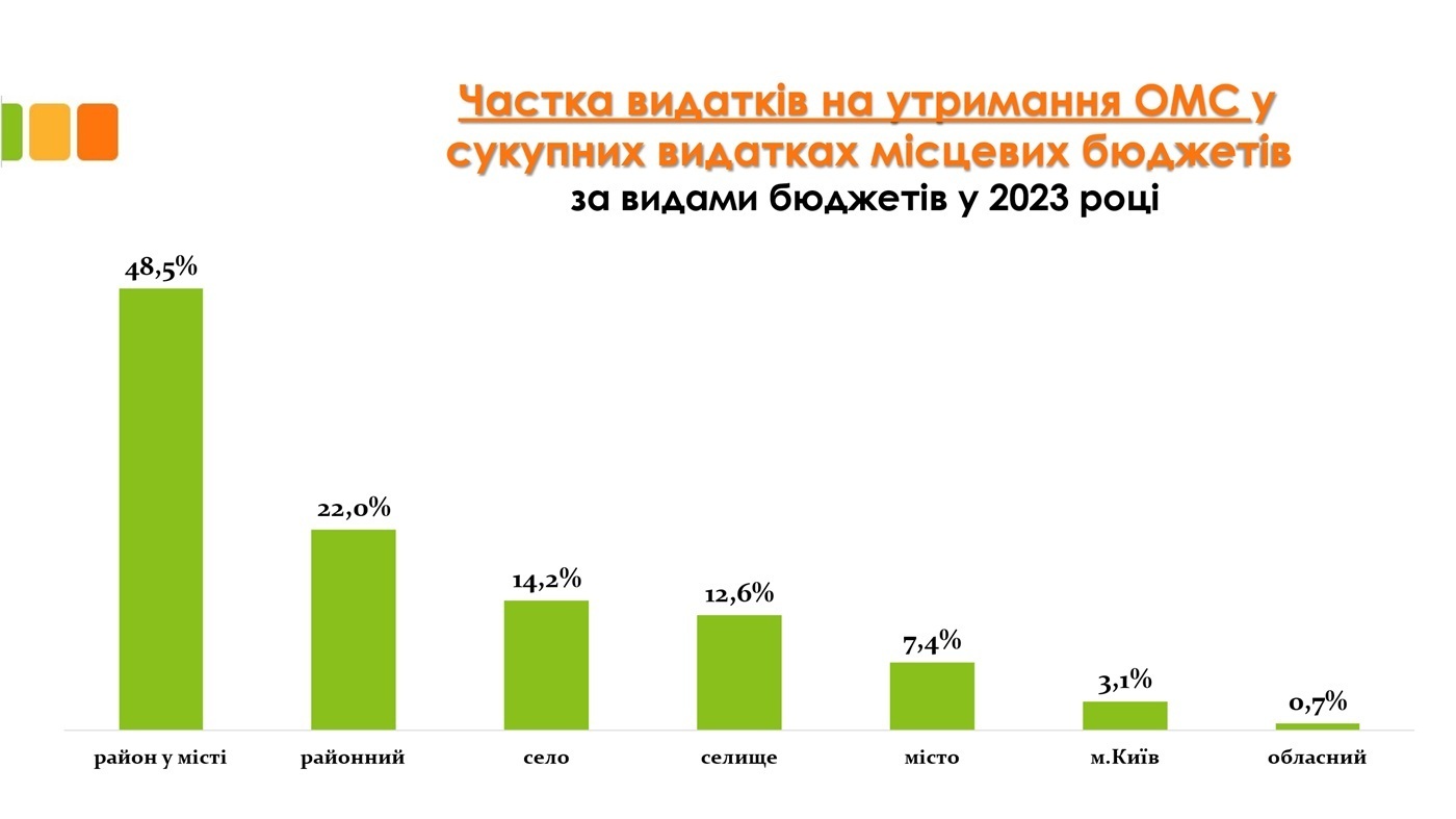 Проаналізуємо частку видатків на утримання апарату органів місцевого самоврядування у сукупних видатках в розрізі типів бюджетів. Очевидним є найнижчий показник в обласних бюджетах, місті Києві та містах. Значно вищий цей показник у селах та селищах - 14,2% та 12,6% відповідно.