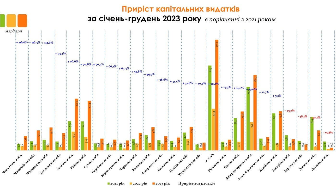 У 2022 році було скорочення капітальних видатків по всіх регіонах. Так, в Києві такі видатки скоротились майже на 11 млрд грн, а в Дніпропетровській області скорочення склали 8,8 млрд грн. Звісно, регіони, в яких ведуться (велися) бойові дії, зазнали найбільших відносних скорочень таких видатків. Найменшого скорочення зазнали капітальні видатки Львівської, Закарпатської та Чернігівської областей. Натомість у 2023 році капітальні видатки зросли у всіх регіонах, порівняно з 2022 роком. Але в порівнянні із 2021 роком додатній приріст відсутній у регіонах де ведуться бойові дії. У свою чергу, найбільший відносний приріст капітальних видатків у 2023 році був у Чернігівській (+116,6%), Миколаївській (+116,3%) та Житомирській (+115,3%) областях.