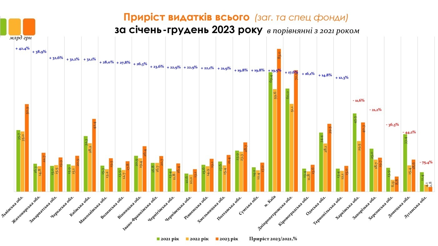 Найбільше зростання видаткової частини бюджету у 2023 році порівняно із довоєнним 2021 роком показала Львівська (+42,4%), Житомирська (+38,9%) та Закарпатська (+32,6%) області. Видаткова частина бюджету міста Києва складає 83,0 млрд грн та показала значний приріст порівняно із 2022 роком.