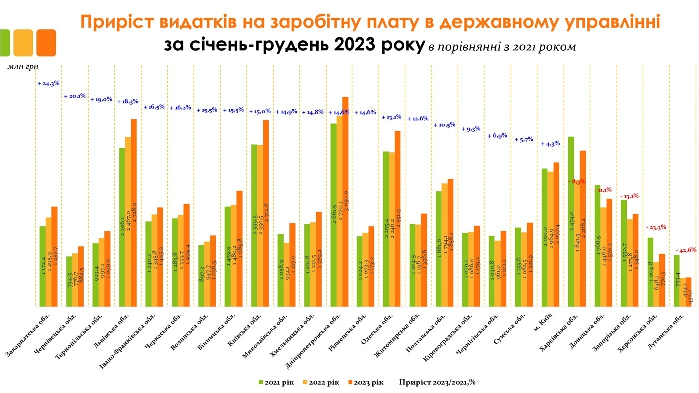 При цьому, видатки на заробітну плату в державному управління в окремих регіонах щорічно зростають, натомість в деяких відновили показники 2021 року, в окремих регіонах цей показник нижче 2021 року. Це області, де ведуться (велися) бойові дії. Так, загалом в Закарпатській області такі видатки зросли на 24,3% або +285,3 млн грн у 2023 році, порівняно з 2021 роком. Також значно в абсолютному вимірі зросли видатки на заробітну плату в органах місцевого самоврядування у Чернівецькій області +148,0 млн грн або +20,1%. У абсолютному вимірі найбільше зросли видатки на ЗП в апараті управління ОМС по Львівській області (+421,9 млн грн).