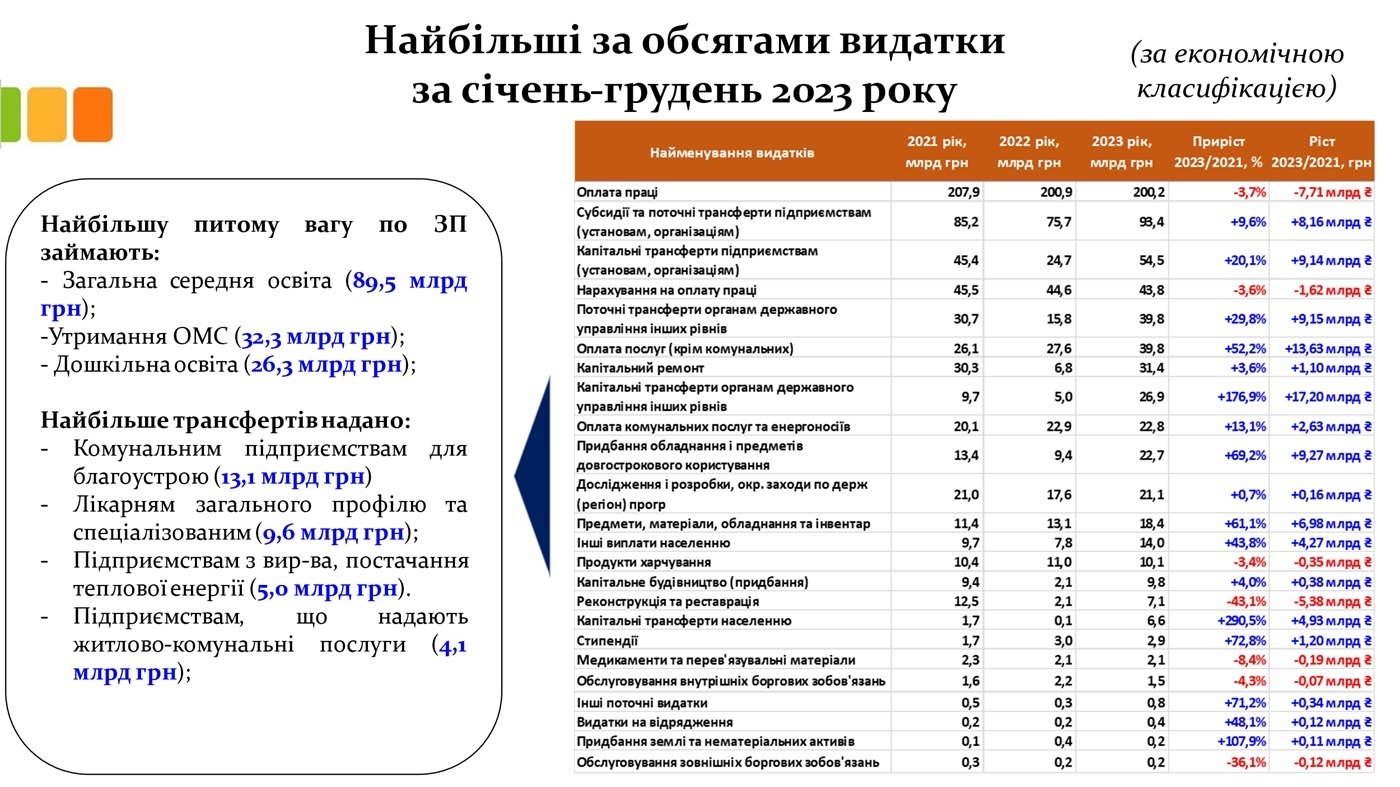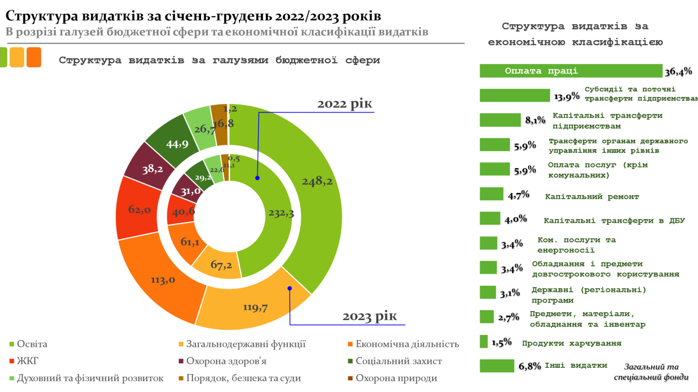 Нижче відображена структура видатків за функціональною класифікацією, яка дає можливість порівняти фінансування того чи іншого сектору, порівняно з 2022 роком. При цьому, також зазнала змін структура видатків за економічною класифікацією. Найбільш вагомі складові зазначено на гістограмі нижче.