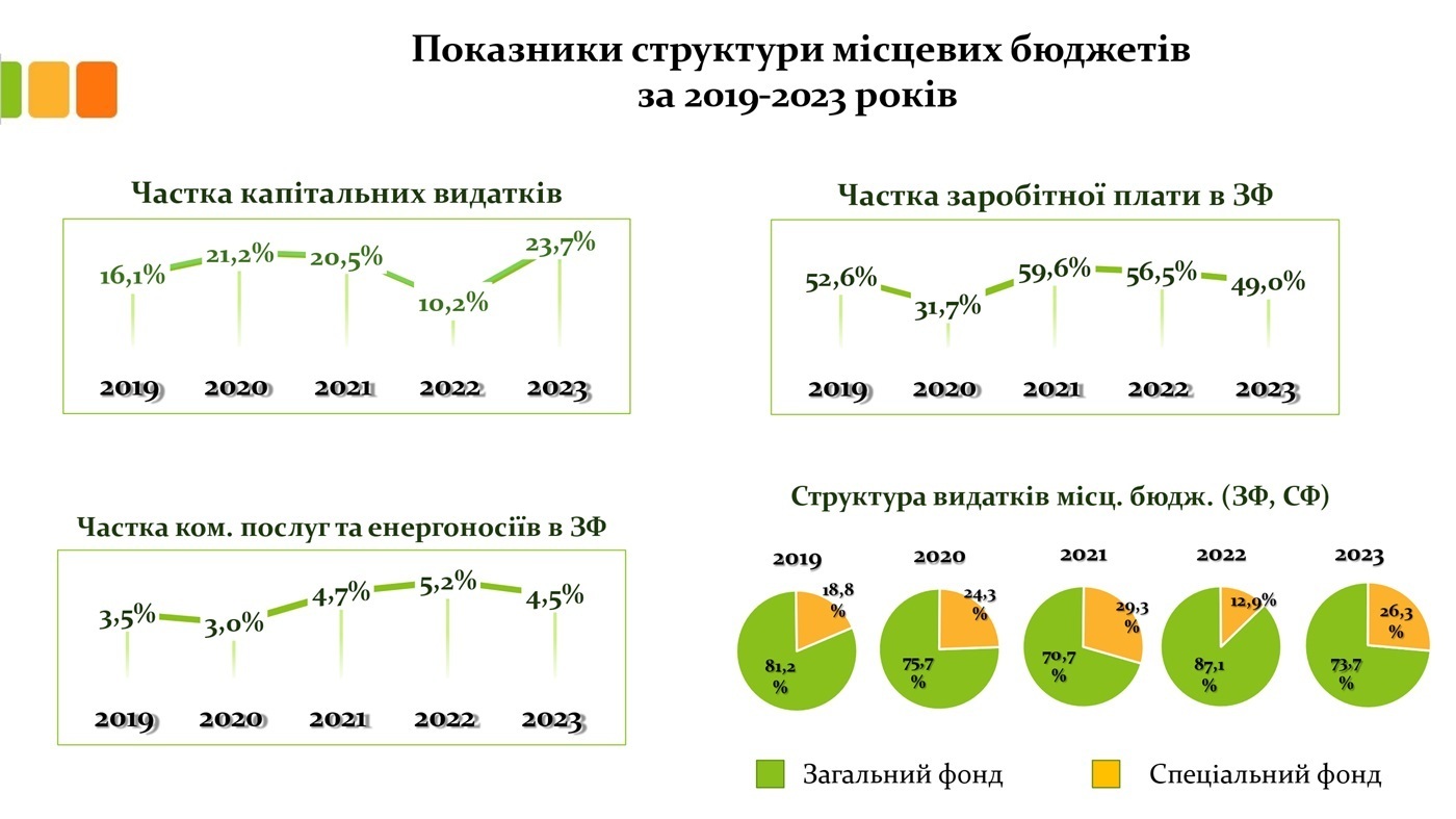 Дослідження видатків місцевих бюджетів за економічною сутністю показують, що частка капітальних видатків місцевих бюджетів з 2018 року щорічно зростала, що вказує на зростання коштів, залучених на оновлення місцевої інфраструктури. Разом з цим, у зв’язку зі зростанням ціни на енергоносії, зросла частка видатків на оплату комунальних послуг та енергоносіїв. 2021 рік був сприятливим для місцевого самоврядування в частині відновлення після антиковідних заходів, видатки спеціального фонду в структурі місцевих бюджетів досягнули позначки майже в 30%. Але війна змісила скоротити такі видатки до 12,9% у структурі доходів місцевих бюджетів, а частка капітальних видатків у 2022 році складала лише 10,2%. Натомість у 2023 році частка капітальних видатків зросла до 23,7%, що є найвищим показником за всю історію функціонування місцевих бюджетів України. Частка заробітної плати залишається високою, що погіршує гнучкість структури видатків місцевих бюджетів.