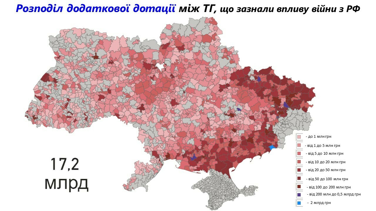 Розмір зазначеної додаткової дотації також значно коливався. Так, бюджет Маріупольської міської територіальної громади у 2023 році отримав 2,0 млрд грн такої додаткової дотації. Найменше отримав бюджет Славутської міської територіальної громади (1 500 грн). Загалом 1113 бюджетів територіальних громад отримали зазначену дотацію. 315 ТГ – до 1 млн грн, 417 ТГ – від 1 до 5 млн грн, 105 ТГ – від 6 до 10 млн грн, 121 ТГ – від 11 до 20 млн грн, 80 ТГ – від 21 до 50 млн грн, 48 тг – від 51 до 100 млн грн, 21 ТГ – від 101 до 200 млн грн, 5 ТГ – від 200 млн до 0,5 млрд грн (Бюджет Лисичанської міської територіальної громади Луганської області, Бюджет Херсонської міської територіальної громади Херсонської області, Бюджет Торецької міської територіальної громади Донецької області, Бюджет Черкаської селищної територіальної громади Дніпропетровської області, Бюджет Чугуївської міської територіальної громади Харківської області), та 1 ТГ – 2 млрд грн.