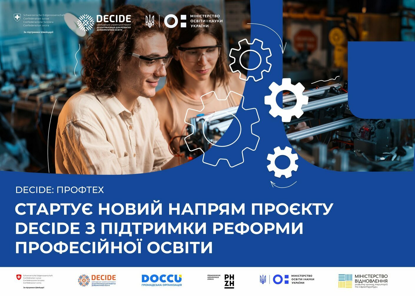 Швейцарсько-український проєкт DECIDE у партнерстві з Міністерством освіти і науки України запускає новий напрям «DECIDE: ПРОФТЕХ» з підтримки реформи професійної освіти в Україні, яка об’єднає зусилля обласних державних адміністрацій та територіальних громад, закладів професійно-технічної освіти, шкіл та бізнесу, щоб побудувати систему профорієнтації та підвищити престижність професійної освіти.