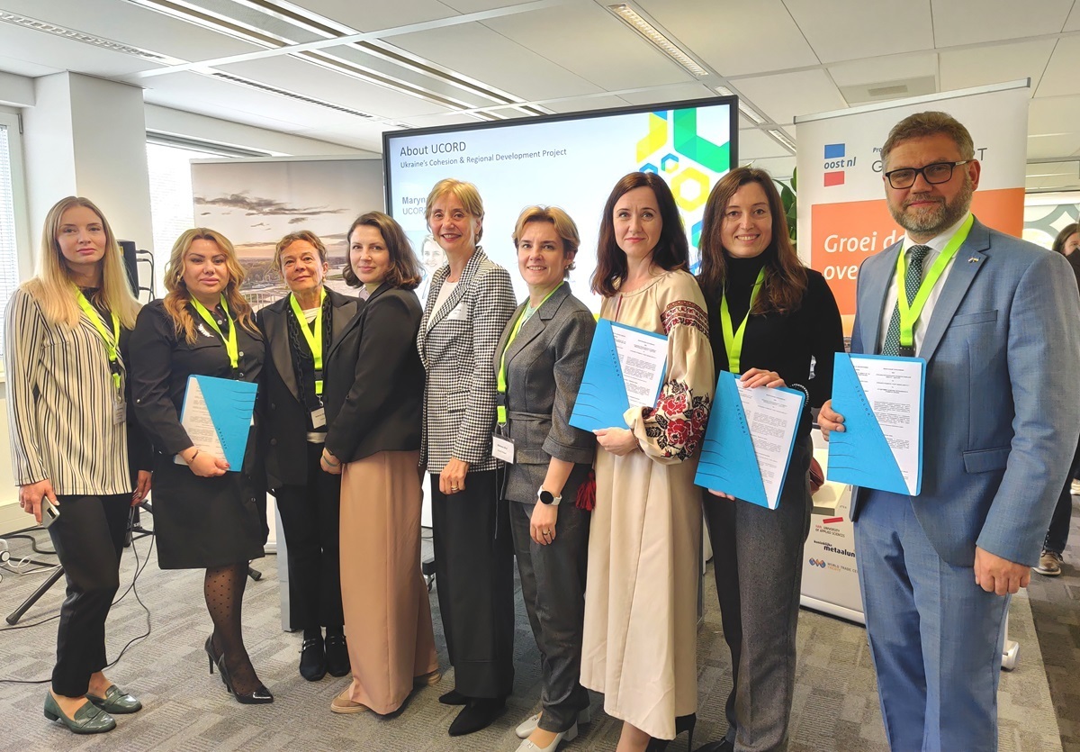 Представники Oost NL, АРР Хмельницької, Вінницької, Одеської та Сумської областей та члени української делегації після підписання меморандумів про співпрацю. Джерело фото: проєкт UCORD