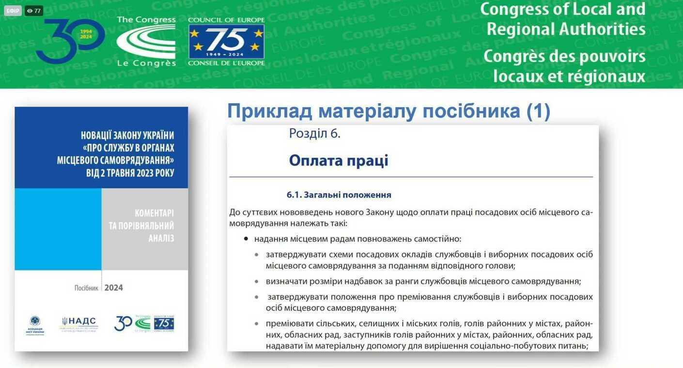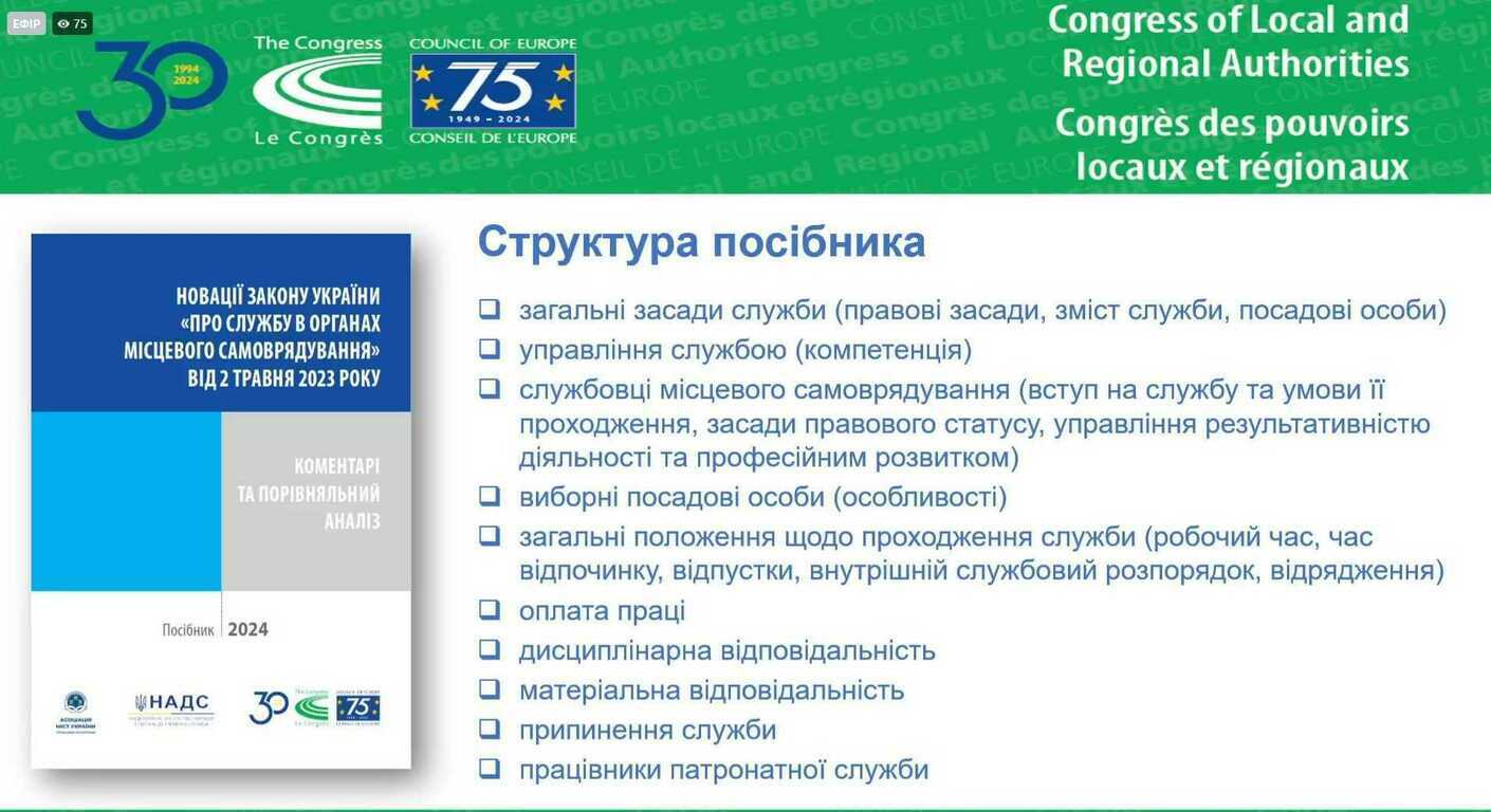 Програма Ради Європи «Посилення доброго демократичного врядування і cтійкості в Україні» у співпраці з Асоціацією міст України та в координації з НАДС підготували посібник «Новації закону України «Про службу в органах місцевого самоврядування» від 2 травня 2023 року: коментарі та порівняльний аналіз».
