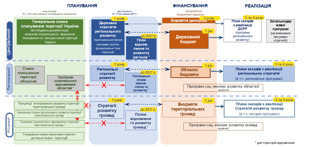 Водночас змінами внесеними у ЗУ «Про регулювання містобудівної діяльності» формується паралельна система планування відновлення, яка суперечить ЗУ «Про засади державної регіональної політики» та загалом підриває систему управління державною регіональною політикою.