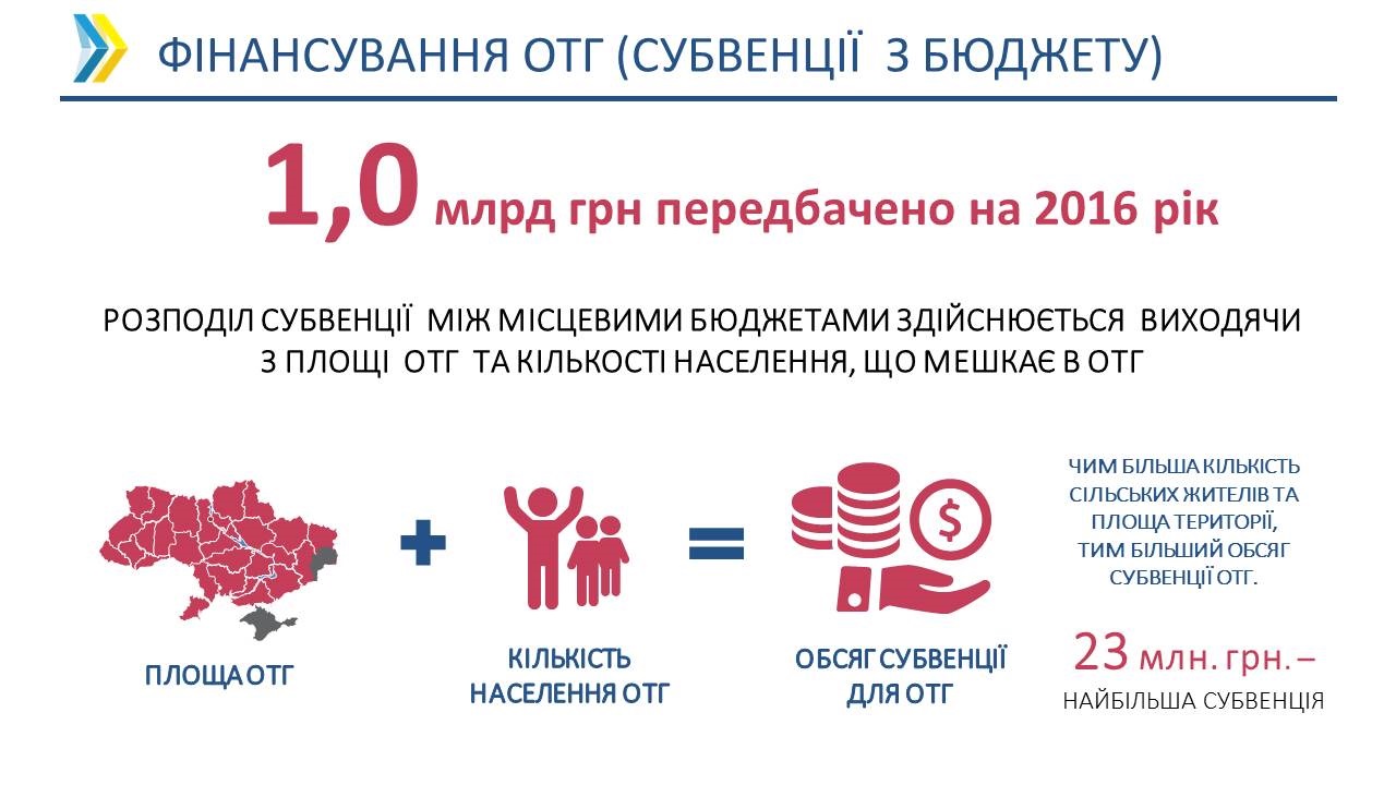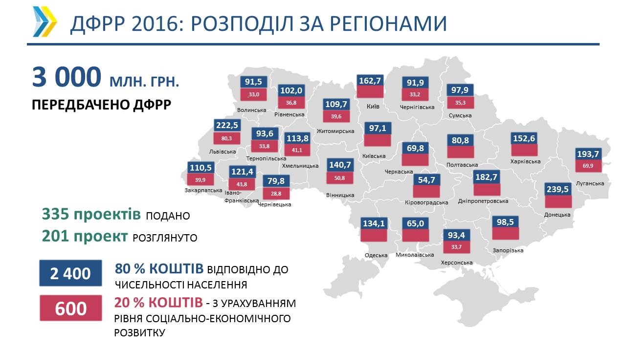 Він також нагадав, що в 2016 році на державну підтримку розвитку регіонів передбачено близько 6 млрд. грн.: 3 млрд. грн. передбачено у Фонді регіонального розвитку, 1 млрд. грн. – субвенція на розвиток інфраструктури об’єднаних територіальних громад, і ще 1,94 млрд. грн. – субвенція на соціально-економічний розвиток окремих територій.