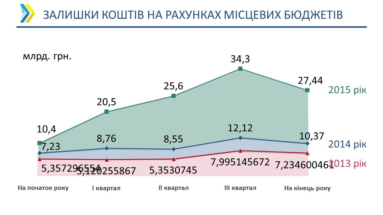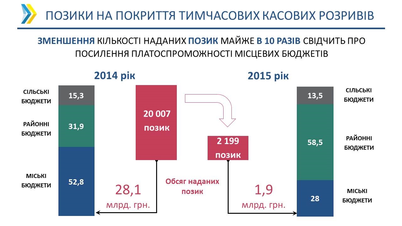 «Завдяки бюджетній децентралізації місцеві бюджети, за результатами 2015 року, були збільшені на 26,9 млрд. грн. Є декілька показових цифр. На 1 січня 2016 року залишок коштів в місцевих бюджетах склав 27,4 млрд. грн., тоді як на 1 січня 2015 року він був на рівні 10,4 млрд. грн. Ще одне — кількість державних позик місцевим бюджетам зменшилася майже в 10 разів. Якщо в 2014 році звернень до держави було більше 20 тисяч, то в 2015 – лише близько 2 тисячі. Отже, у громад з’явилися додаткові фінансові можливості, збільшилася їхня платоспроможність. Більше того, звернувшись до казначейства, громади отримують свої кошти вже протягом доби. Такого в Україні не було ніколи», — зазначив Геннадій Зубко.