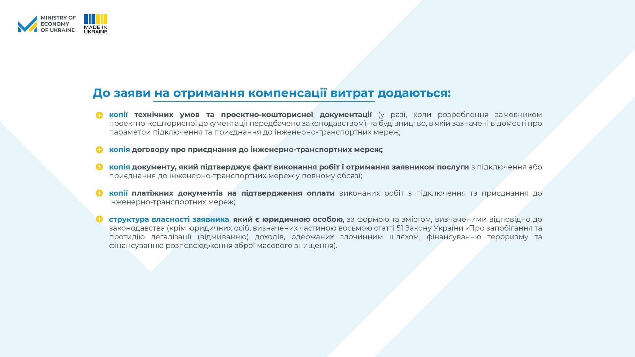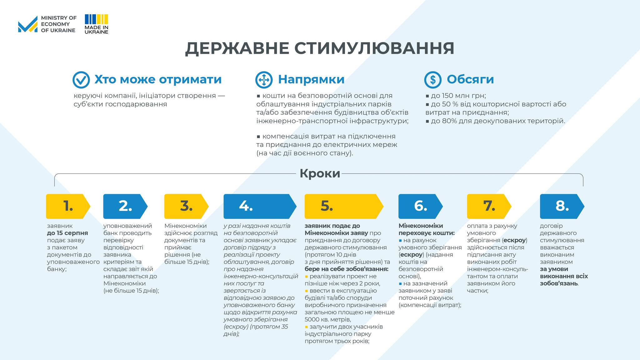 Порядком надання державного стимулювання передбачено надання коштів ініціаторам створення або керуючим компаніям індустріальних парків для облаштування або будівництва інженерно-транспортної інфраструктури, а також часткове відшкодування вартості приєднання до електричних мереж.