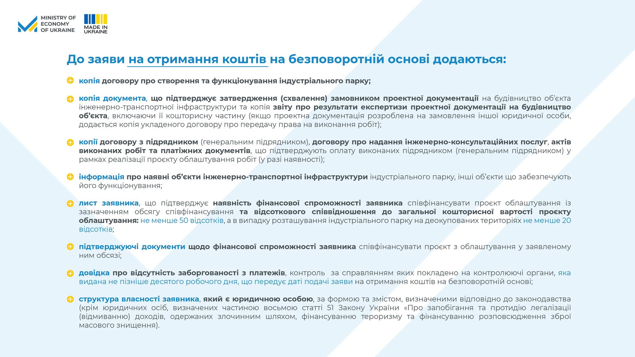 Максимальний розмір стимулювання складає 150 млн грн, при цьому співфінансування робіт відбуватиметься у співвідношенні 50 на 50. Ініціатори створення або керуючі компанії індустріальних парків з деокупованих територій зможуть реалізовувати проєкти у співфінансуванні 80 на 20, тобто держава зі свого боку оплатить до 80 % кошторисної вартості робіт, але не більше 150 млн грн.