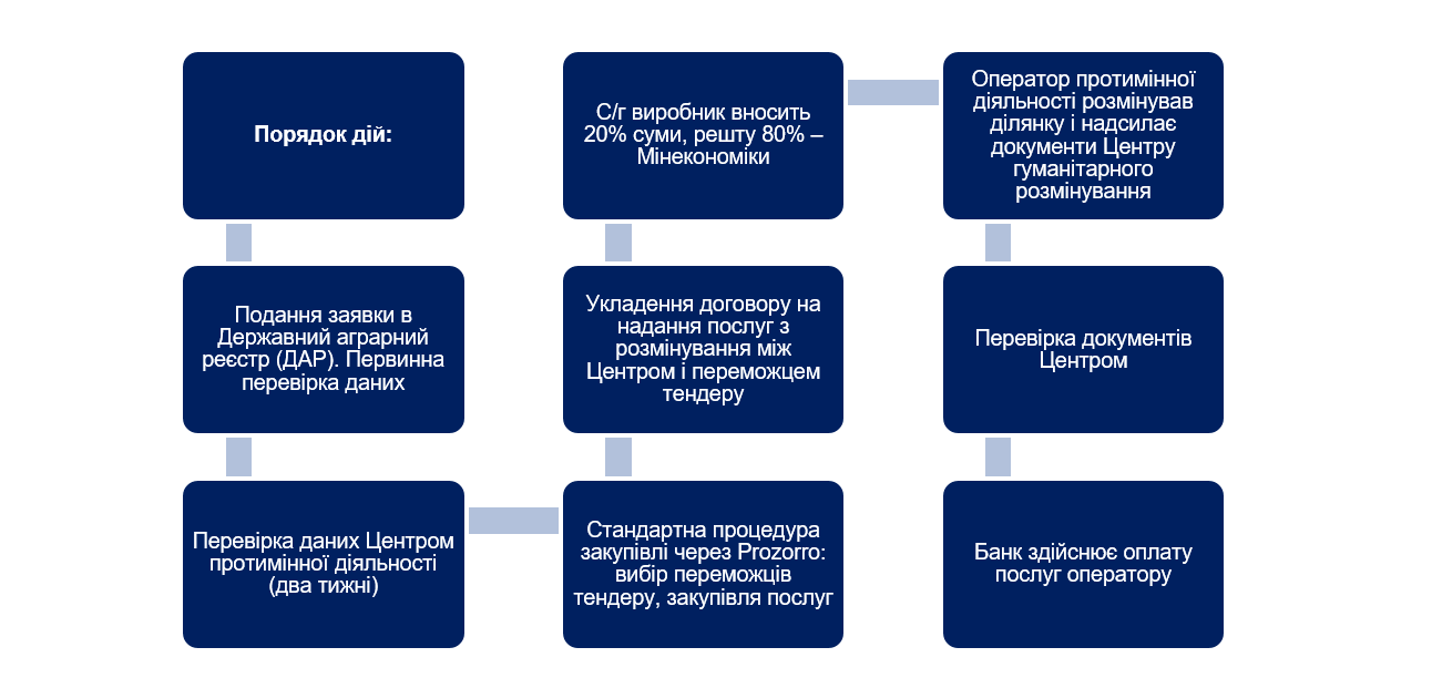 Розмір компенсації: компенсація здійснюється на безповоротній основі за фактично надані сертифікованими операторами протимінної діяльності послуги з розмінування земельних ділянок сільськогосподарського призначення в поточному році в розмірі 80% вартості таких послуг за рахунок бюджетних коштів та 20% – за рахунок коштів сільськогосподарських товаровиробників.