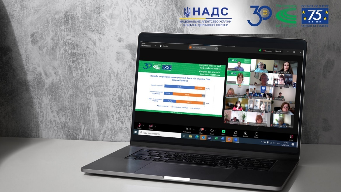 14 червня Програма Ради Європи «Посилення доброго демократичного врядування і cтійкості в Україні» у партнерстві з Національним агентством України з питань державної служби (НАДС) і його Генеральним департаментом з питань професійного розвитку державних службовців та посадових осіб місцевого самоврядування провела презентацію результатів третього Всеукраїнського дослідження потреб у професійному навчанні посадових осіб місцевого самоврядування та депутатів місцевих рад (далі – Всеукраїнське дослідження) для представників Вищої школи публічного управління та регіональних центрів підвищення кваліфікації.
