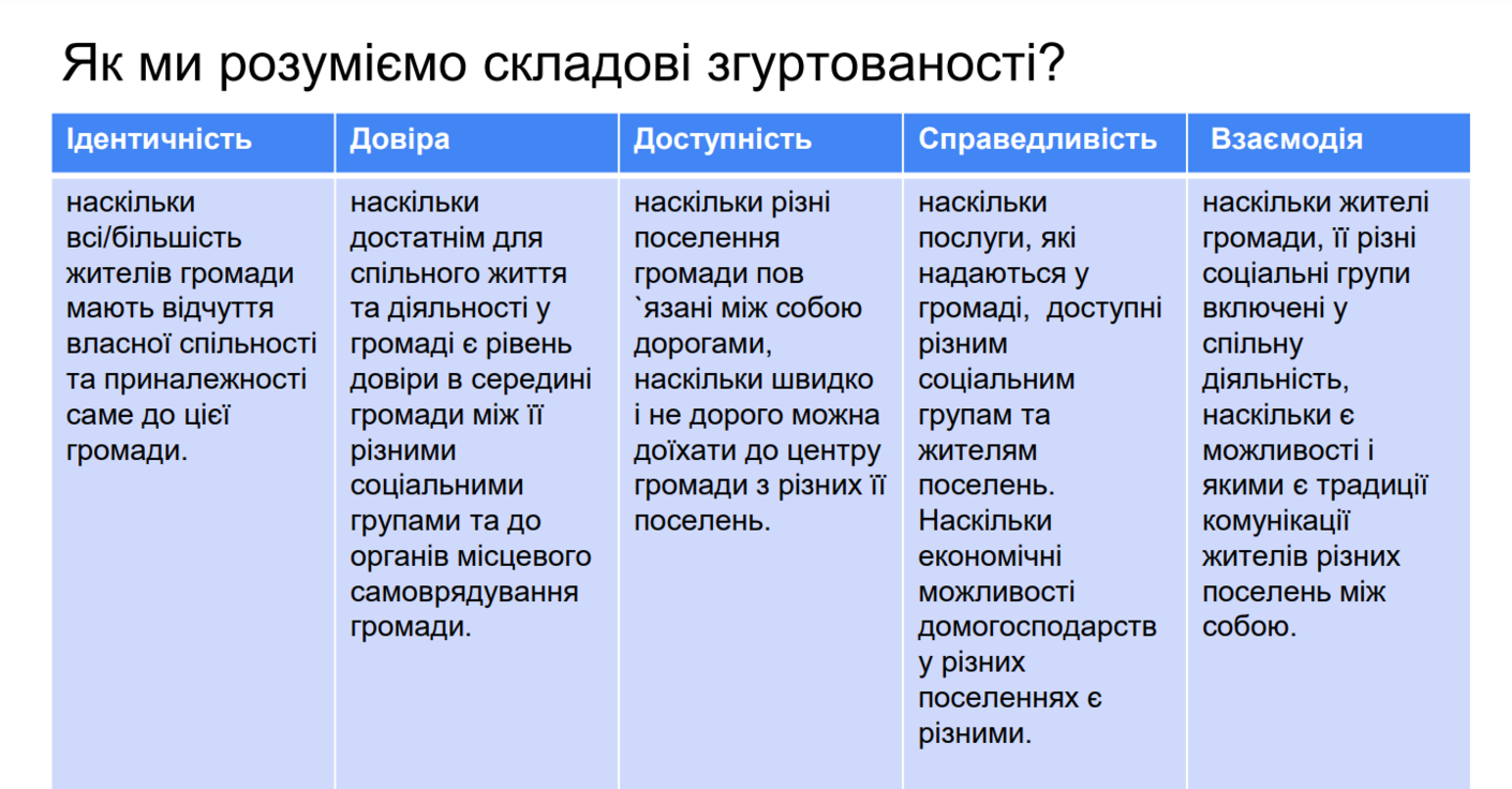 За визначенням експертів, «згуртованість територіальної громади є здатністю жителів територіальної громади, органів місцевого самоврядування, які вони обирають чи які формуються у територіальній громаді на підставі закону, об`єднувати зусилля та провадити дії, що забезпечують стійкість та розвиток громади в інтересах її жителів. Згуртованість громади базується на таких елементах: ідентичність, довіра, доступність, справедливість, взаємодія».