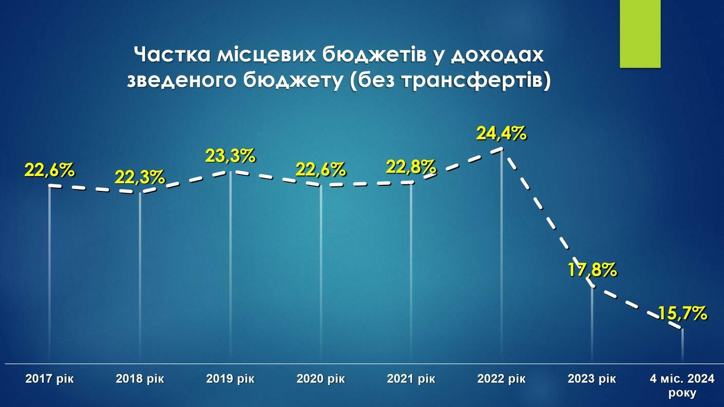 У 2023 році частка місцевих бюджетів різко знизилася до 17,8%, а у перші чотири місяці 2024 року ще більше впала до 15,7%. Це зниження є наслідком вилучення військового ПДФО з місцевих бюджетів, яке відбулося у жовтні 2023 року, а також через значне зростання надходжень до державного бюджету окремих податків (зазначено вище). Таке рішення значно зменшило доходи місцевих бюджетів, що відобразилося на їх частці у зведеному бюджеті України. Це найнижчий показник з початку децентралізаційної реформи, але він зумовлений зростаючими видатками державного бюджету на сектор безпеки та оборони, які необхідно покривати за рахунок власних джерел.
