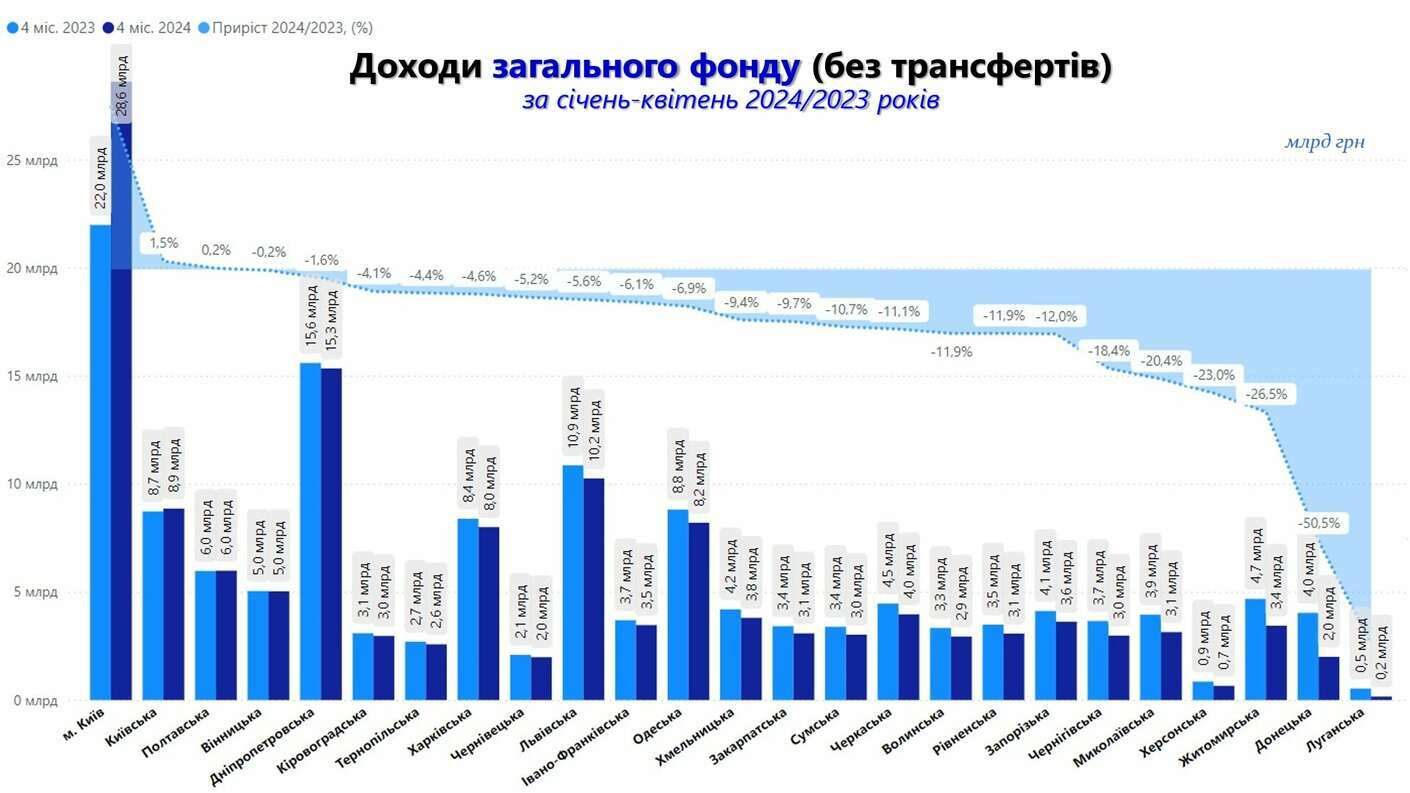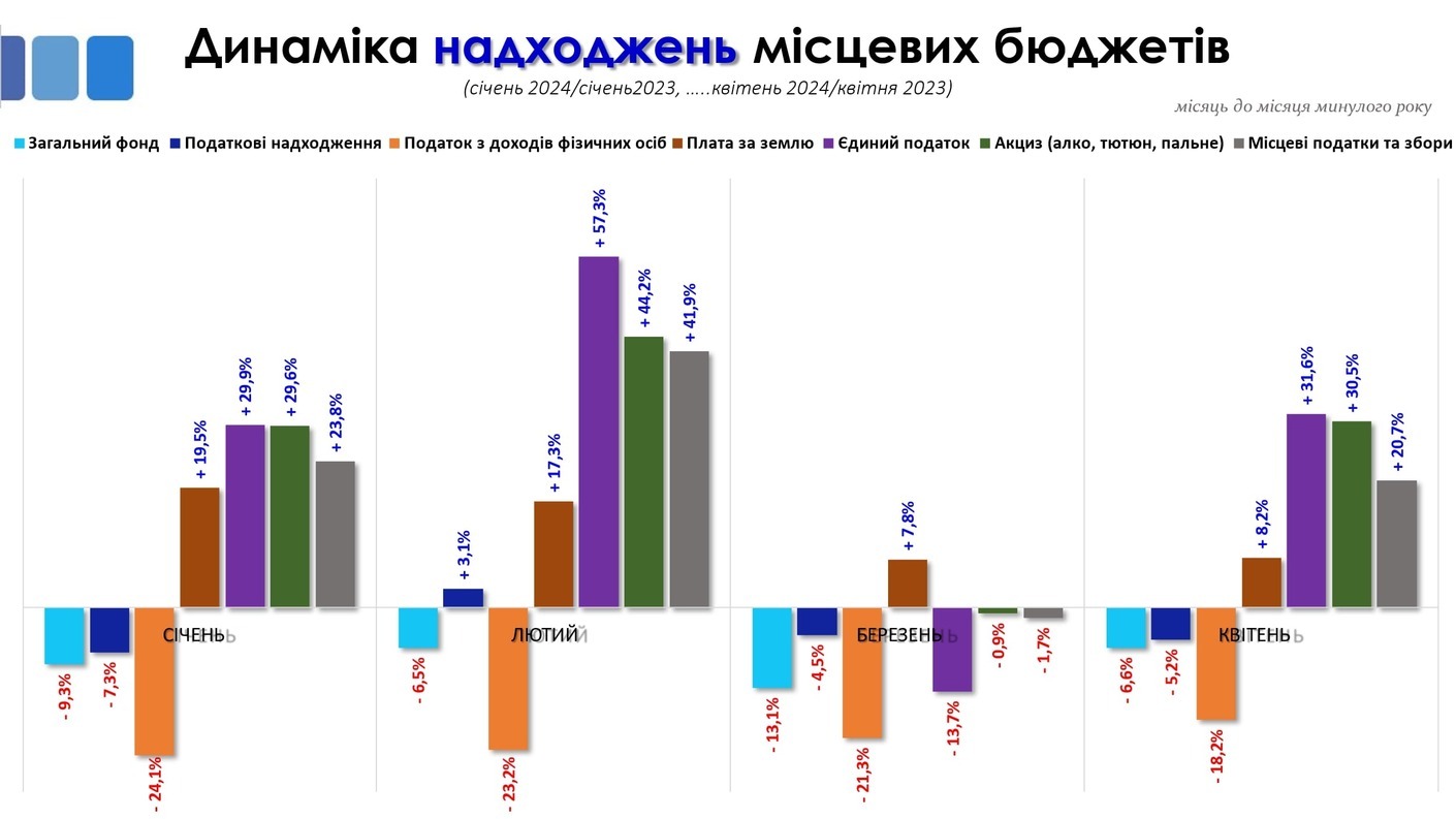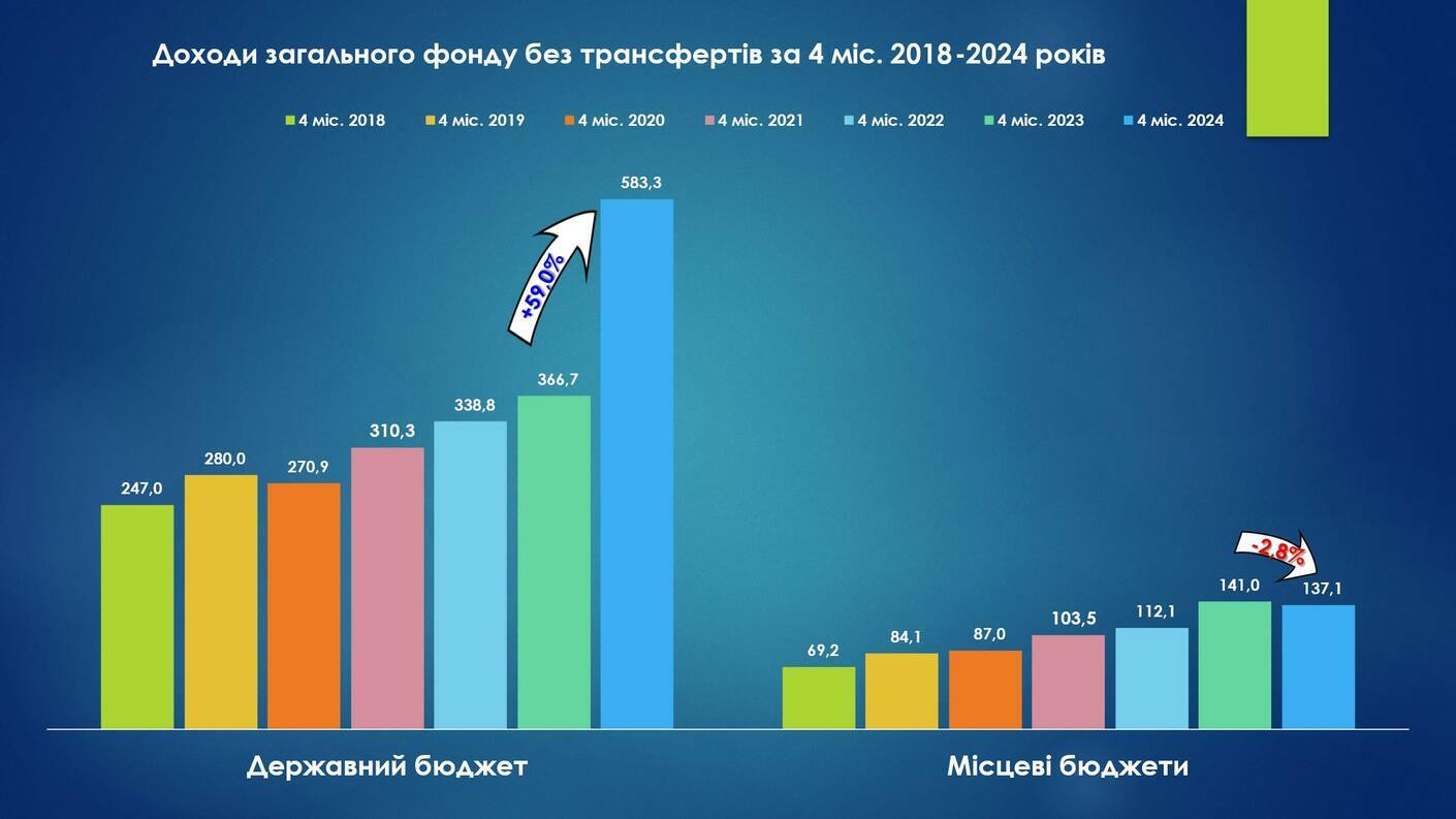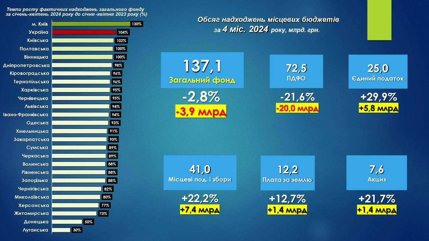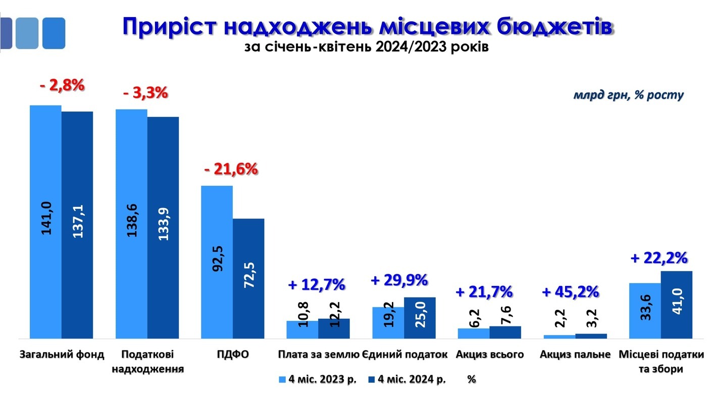 Загалом за 4 місяці 2024 року загальний фонд зменшився на 2,8%, з 141,0 млрд грн до 137,1 млрд грн. Податкові надходження також знизилися на 3,3%, з 138,6 млрд грн до 133,9 млрд грн. Найбільше зниження показав податок на доходи фізичних осіб (ПДФО), який впав на 21,6%, з 92,5 млрд грн до 72,5 млрд грн.